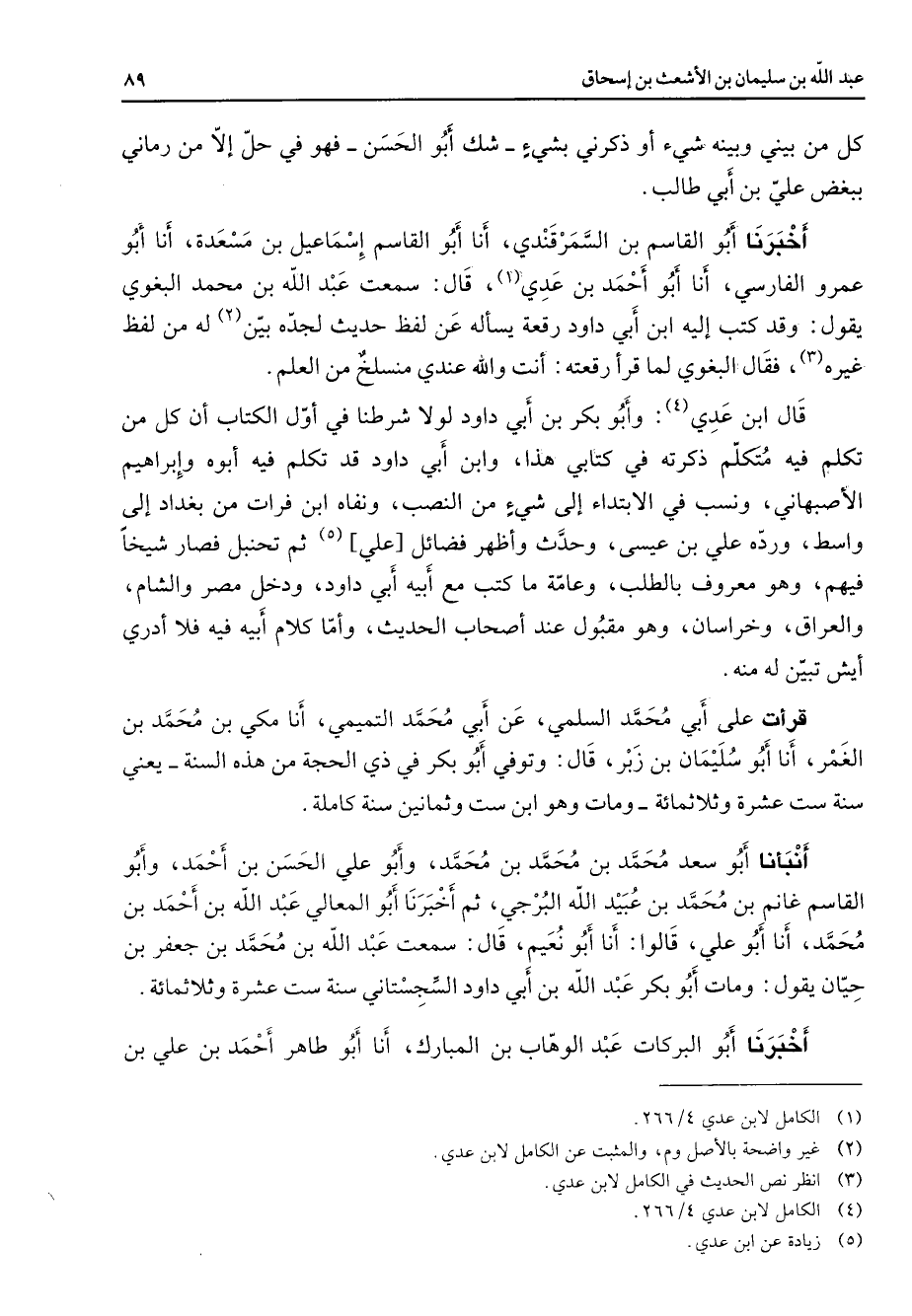 كل من بيني وبينه شئ أو ذكرني بشئ شك أبو الحسن فهو في حل إلا من رماني ببغض علي بن أبي طالب أخبرنا أبو القاسم بن السمرقندي أنا أبو القاسم إسماعيل بن مسعدة أنا أبو عمرو الفارسي أنا أبو أحمد بن عدي (1) قال سمعت عبد الله بن محمد البغوي يقول وقد كتب إليه ابن أبي داود رقعة يسأله عن لفظ حديث لجده بين (2) له من لفظ غيره (3) فقال البغوي لما قرأ رقعته أنت والله عندي منسلخ من العلم قال ابن عدي (4) وأبو بكر بن أبي داود لولا شرطنا في أول الكتاب أن كل من تكلم فيه متكلم ذكرته في كتابي هذا وابن أبي داود قد تكلم فيه أبوه وإبراهيم الأصبهاني ونسب في الابتداء إلى شئ من النصب ونفاه ابن فرات من بغداد إلى واسط ورده علي بن عيسى وحدث وأظهر فضائل علي (5) ثم تحنبل فصار شيخا فيهم وهو معروف بالطلب وعامة ما كتب مع أبيه أبي داود ودخل مصر والشام والعراق وخراسان وهو مقبول عند أصحاب الحديث وأما كلام أبيه فيه فلا أدري أيش تبين له منه قرأت على أبي محمد السلمي عن أبي محمد التميمي أنا مكي بن محمد بن الغمر أنا أبو سليمان بن زبر قال وتوفي أبو بكر في ذي الحجة من هذه السنة يعني سنة ست عشرة وثلاثمائة ومات وهو ابن ست وثمانين سنة كاملة أنبأنا أبو سعد محمد بن محمد بن محمد وأبو علي الحسن بن أحمد وأبو القاسم غانم بن محمد بن عبيد الله البرجي ثم أخبرنا أبو المعالي عبد الله بن أحمد بن محمد أنا أبو علي قالوا أنا أبو نعيم قال سمعت عبد الله بن محمد بن جعفر بن حيان يقول ومات أبو بكر عبد الله بن أبي داود السجستاني سنة ست عشرة وثلاثمائة أخبرنا أبو البركات عبد الوهاب بن المبارك أنا أبو طاهر أحمد بن علي بن