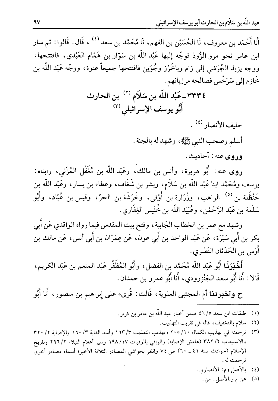 3334 - عبد الله بن سلام (2) بن الحارث أبو يوسف الإسرائيلي (3) حليف الأنصار (4) أسلم وصحب النبي (صلى الله عليه وسلم) وشهد له بالجنة وروى عنه أحاديث روى عنه أبو هريرة وأنس بن مالك وعبد الله بن مغفل المزني وابناه يوسف ومحمد ابنا عبد الله بن سلام وبشر بن شغاف وعطاء بن يسار وعبد الله بن حنظلة بن (5) الراهب وزرارة بن أوفى وخرشة بن الحر وقيس ابن عباد وأبو سلمة بن عبد الرحمن وعبيد الله بن خنيس الغفاري وشهد مع عمر بن الخطاب الجابية وفتح بيت المقدس فيما رواه الواقدي عن أبي بكر بن أبي سبرة عن عبد الواحد بن أبي عون عن عمران بن أبي أنس عن مالك بن أوس بن الحدثان النصري أخبرنا أبو عبد الله محمد بن الفضل وأبو المظفر عبد المنعم بن عبد الكريم قالا أنا أبو سعد الجنزرودي أنا أبو عمرو بن حمدان ح وأخبرتنا أم المجتبى العلوية قالت قرئ على إبراهيم بن منصور أنا أبو