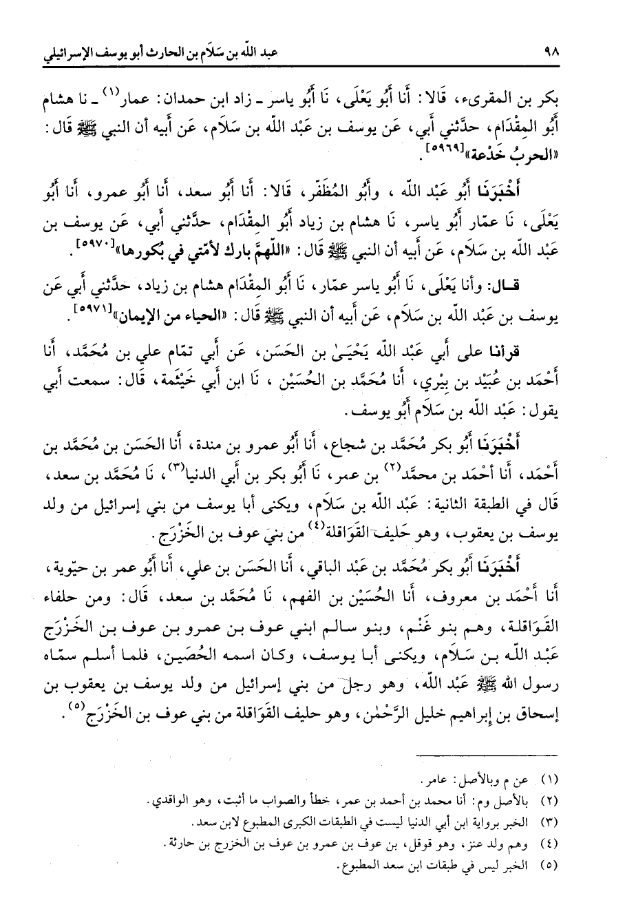 [5971] قرأنا على أبي عبد الله يحيى بن الحسن عن أبي تمام علي بن محمد أنا أحمد بن عبيد بن بيري أنا محمد بن الحسين نا ابن أبي خيثمة قال سمعت أبي يقول عبد الله بن سلام أبو يوسف أخبرنا أبو بكر محمد بن شجاع أنا أبو عمرو بن مندة أنا الحسن بن محمد بن أحمد أنا أحمد بن محمد (2) بن عمر نا أبو بكر بن أبي الدنيا (3) نا محمد بن سعد قال في الطبقة الثانية عبد الله بن سلام ويكنى أبا يوسف من بني إسرائيل من ولد يوسف بن يعقوب وهو حليف القواقلة (4) من بني عوف بن الخزرج أخبرنا أبو بكر محمد بن عبد الباقي أنا الحسن بن علي أنا أبو عمر بن حيوية أنا أحمد بن معروف أنا الحسين بن الفهم نا محمد بن سعد قال ومن حلفاء القواقلة وهم بنو غنم وبنو سالم ابني عوف بن عمرو بن عوف بن الخزرج عبد الله بن سلام ويكنى أبا يوسف وكان اسمه الحصين فلما أسلم سماه رسول الله (صلى الله عليه وسلم) عبد الله وهو رجل من بني إسرائيل من ولد يوسف بن يعقوب بن إسحاق بن إبراهيم خليل الرحمن وهو حليف القواقلة من بني عوف بن الخزرج (5)