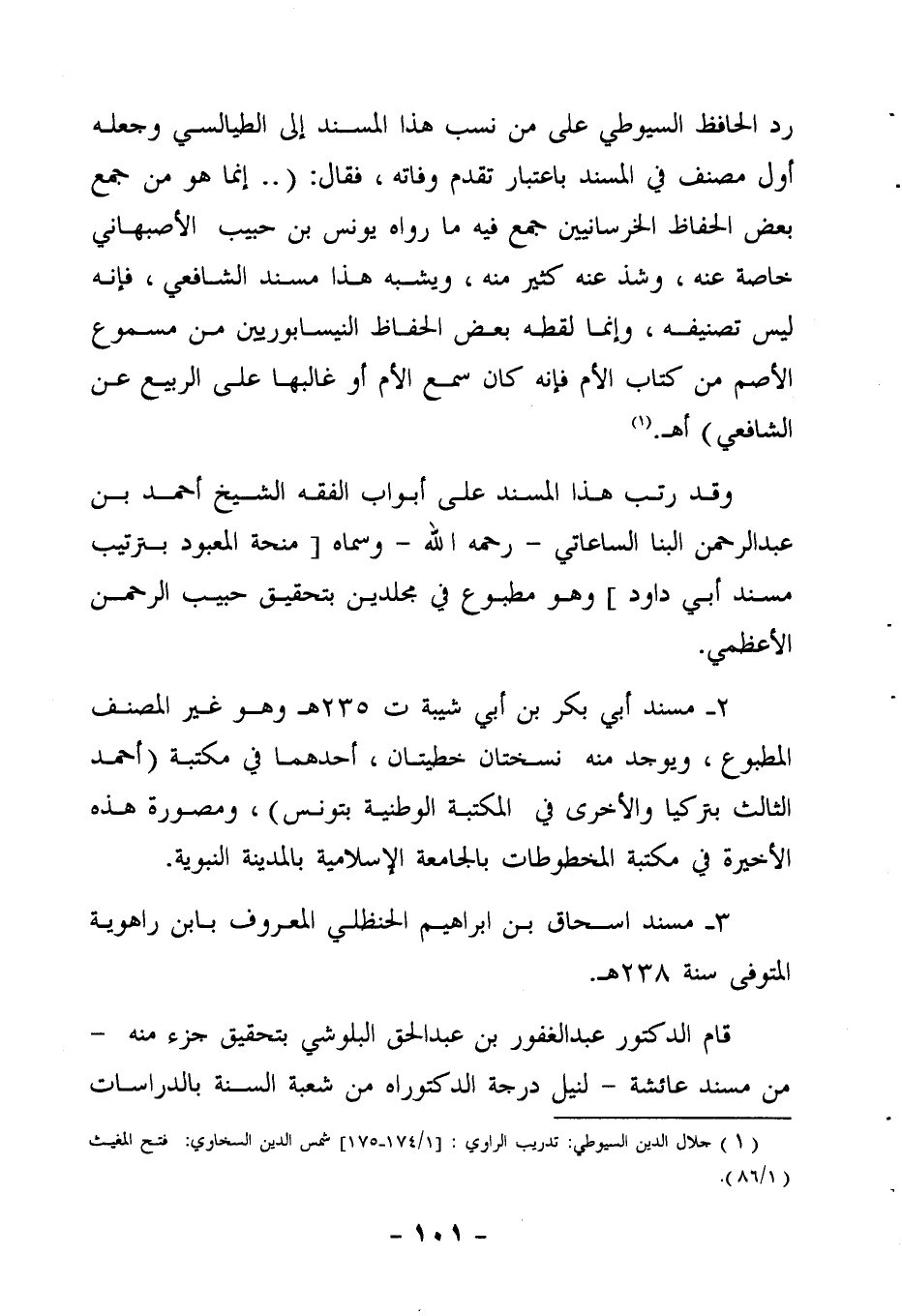 ردَّ الحافظ السيوطي على من نسب هذا المسند إلى الطيالسي وجعله أول مصنف في المسند باعتبار تقدم وفاته، فقال: "إنما هو من جمع بعض الحفاظ الخراسانيين جمع فيه ما رواه يونس بن حبيب الأصبهاني خاصة عنه، وشذَّ عنه كثير منه، ويشبه هذا "مسند الشافعي" فإنه ليس تصنيفه، وإنما لقطه بعض الحفاظ النيسابوريين من مسموع الأصم من كتاب "الأم" فإنه كان سمع "الأم" أو غالبها على الربيع عن الشافعي". 1