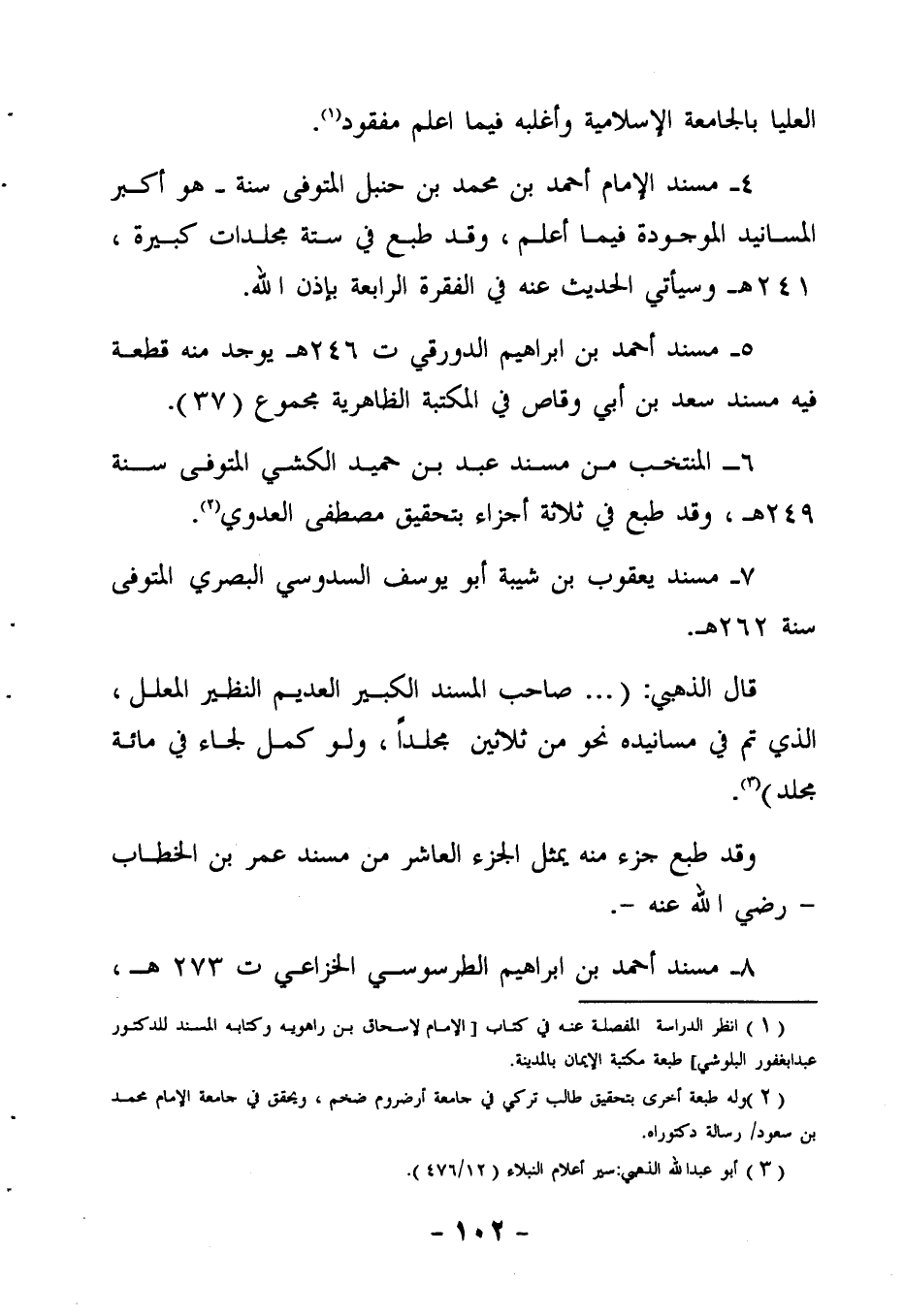 3 أبو عبد الله الذهبي: سير أعلام النبلاء 12 / 476 وقال عن منهجه فيه ص 477: "يخرج العالي والنازل، ويذكر أولاً سيرة الصحابي مستوفاة، ثم يذكر ما رواه، ويوضح علل الأحاديث، ويتكلم على الرجال، ويجرِّح ويعدِّل بكلامٍ مفيدٍ عذبٍ شافٍ، بحيث إن الناظر في مسنده لا يَملُّ منه، لكن قلَّ من روى عنه".