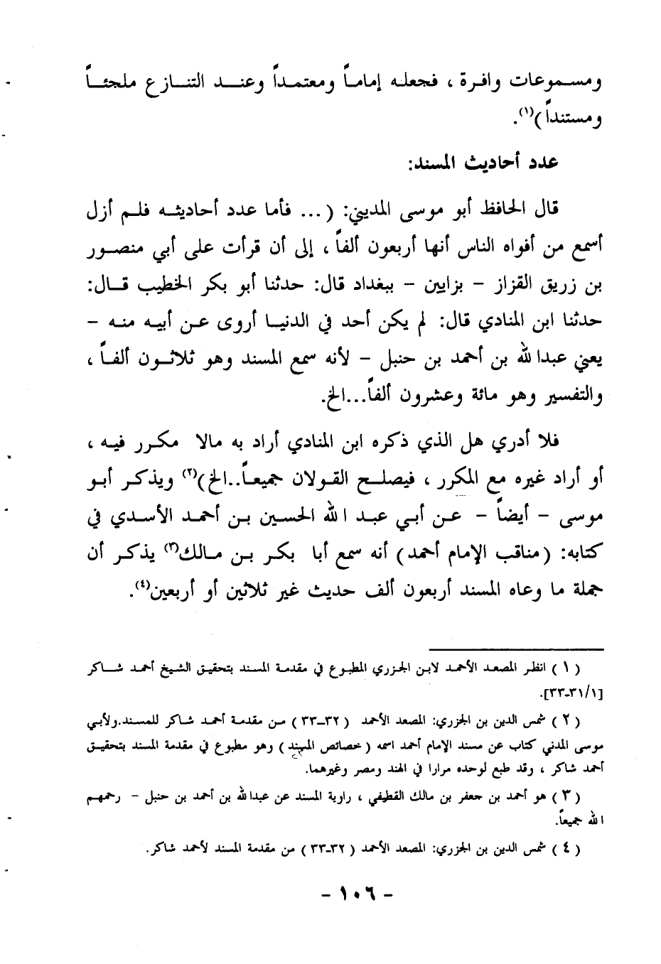 2 شمس الدين ابن الجزري: المصعد الأحمد ص: 32 – 33 من مقدمة أحمد شاكر للمسند، ولأبي موسى المديني كتاب عن مسند الإمام أحمد اسمه "خصائص المسند" وهو مطبوع في مقدمة المسند بتحقيق أحمد شاكر، وقد طبع مفرداً مراراً في الهند ومصر وغيرهما.