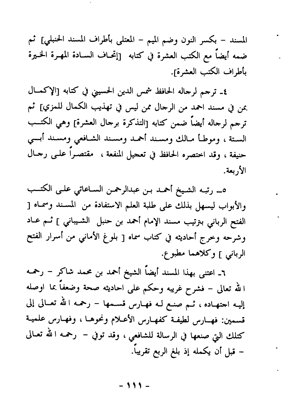 5- رتبه الشيخ أحمد بن عبد الرحمن الساعاتى على الكتب والأبواب ليسهل بذلك على طلبة العلم الاستفادة من المسند وسماه "الفتح الربانى بترتيب مسند الإمام أحمد بن حنبل الشيباني"، ثم عاد وشرحه وخرج أحاديثه في كتاب سماه "بلوغ الأماني من أسرار الفتح الرباني"، وكلاهما مطبوع.