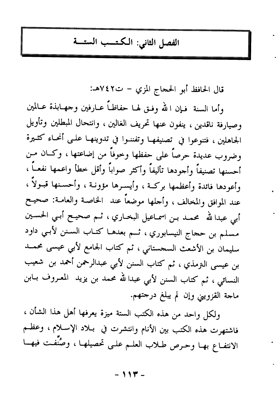 قال الحافظ أبو الحجاج المزي (ت 742 هـ) : "وأما السُّنَّة فإن الله وفق لها حفاظاً عارفين وجهابذة عالمين وصيارفة ناقدين، ينفون عنها تحريف الغالين، وانتحال المبطلين وتأويل الجاهلين، فتنوعوا في تصنيفها وتفننوا في تدوينها على أنحاء كثيرة وضروب عديدة حرصاً على حفظها وخوفاً من إضاعتها، وكان من أحسنها تصنيفاً وأجودها تأليفاً وأكثرها صواباً وأقلها خطأً، وأعمها نفعاً، وأعودها فائدة وأعظمها بركة، وأيسرها مؤونة، وأحسنها قبولاً، عند الموافق والمخالف، وأجُّلها موضعاً عند الخاصة والعامة: "صحيح أبي عبد الله محمد بن إسماعيل البخاري"، ثم "صحيح أبي الحسين مسلم بن حجاج النيسابوري"، ثم بعدهما كتاب "السنن" لأبي داود سليمان بن الأشعث السجستاني، ثم كتاب"الجامع" لأبي عيسى محمد بن عيسى الترمذي، ثم كتاب "السنن" لأبى عبد الرحمن أحمد بن شعيب النسائي، ثم كتاب "السنن" لأبي عبد الله محمد بن يزيد المعروف بابن ماجه القزويني وإن لم يبلغ درجتهم.