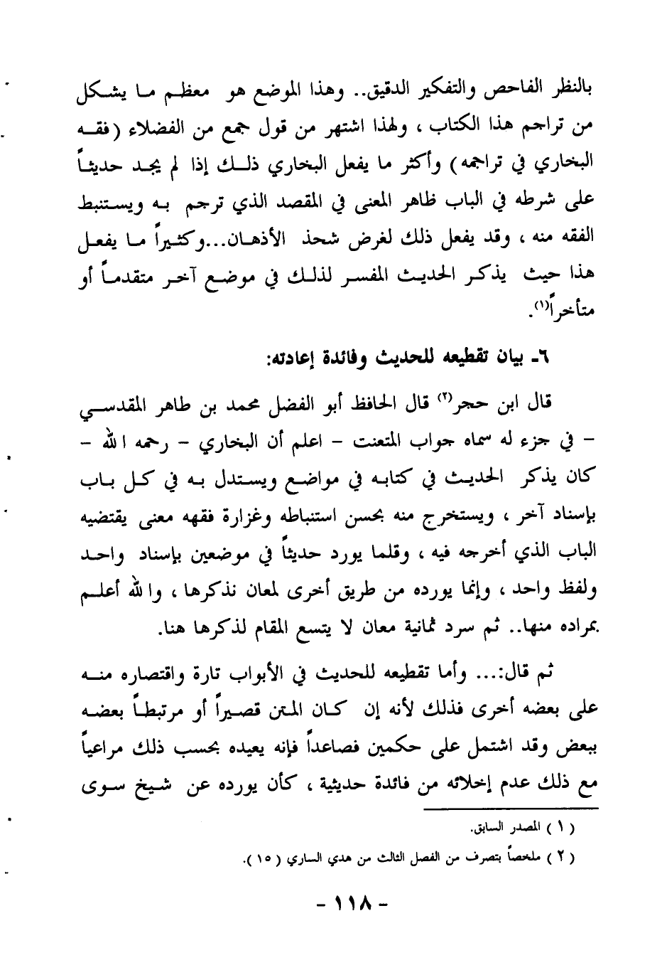 قال ابن حجر: "قال الحافظ أبو الفضل محمد بن طاهر المقدسي - في جزء له سماه "جواب المتعنت" -: اعلم أن البخاري - رحمه الله - كان يذكر الحديث في كتابه في مواضع ويستدل به في كل باب بإسنادٍ آخر، ويستخرج منه بحسن استنباطه وغزارة فقهه معنى يقتضيه الباب الذى أخرجه فيه، وقلما يورد حديثاً في موضعين بإسناد واحد ولفظ واحد، وإنما يورده من طريق أخرى لمعانٍ نذكرها، والله أعلم بمراده منها ثم سرد ثمانية معانٍ لا يتسع المقام لذكرها هنا".