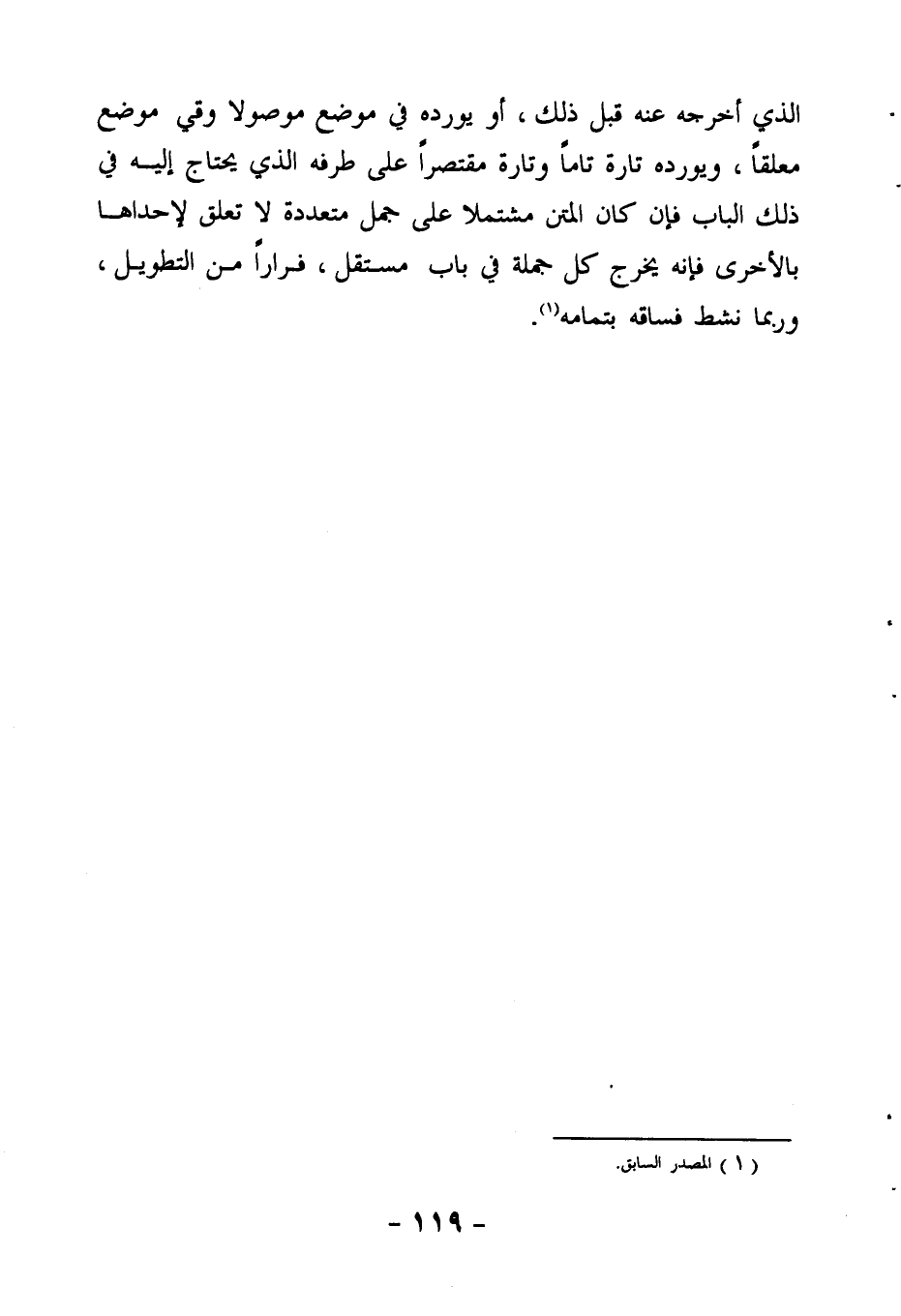 الذي أخرجه عنه قبل ذلك، أو يورده في موضع موصولاً وفي موضع معلقاً، ويورده تارة تاماً، وتارة مقتصراً على طرفه الذي يحتاج إليه في ذلك الباب، فإن كان المتن مشتملاً على جملٍ متعددة لا تعلق لإحداها بالأخرى فإنه يخرج كل جملة في باب مستقل فراراً من التطويل، وربما نشط فساقه بتمامه"1