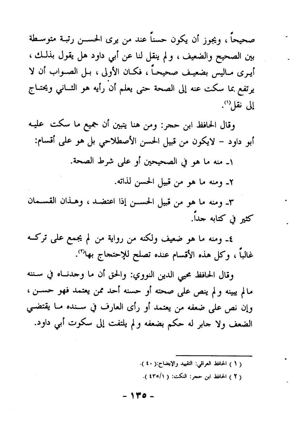 وقال الحافظ ابن حجر: "ومن هنا يتبين أن جميع ما سكت عليه أبو داود لا يكون من قبيل الحسن الاصطلاحى بل هو على أقسام: