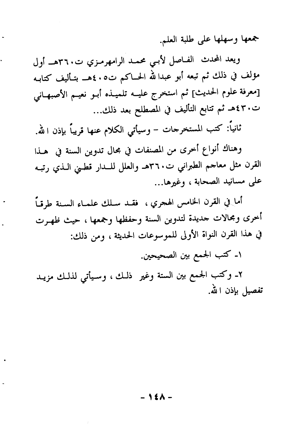 ويعد المحدث الفاصل لأبى محمد الرامهرمزي (ت 360 هـ) أول مؤلَّف في ذلك، ثم تبعه أبو عبد الله الحاكم (ت 405 هـ) بتأليف كتابه "معرفة علوم الحديث"، ثم استخرج عليه تلميذه أبو نعيم الأصبهاني (ت 430 هـ) ثم تتابع التأليف في المصطلح بعد ذلك.