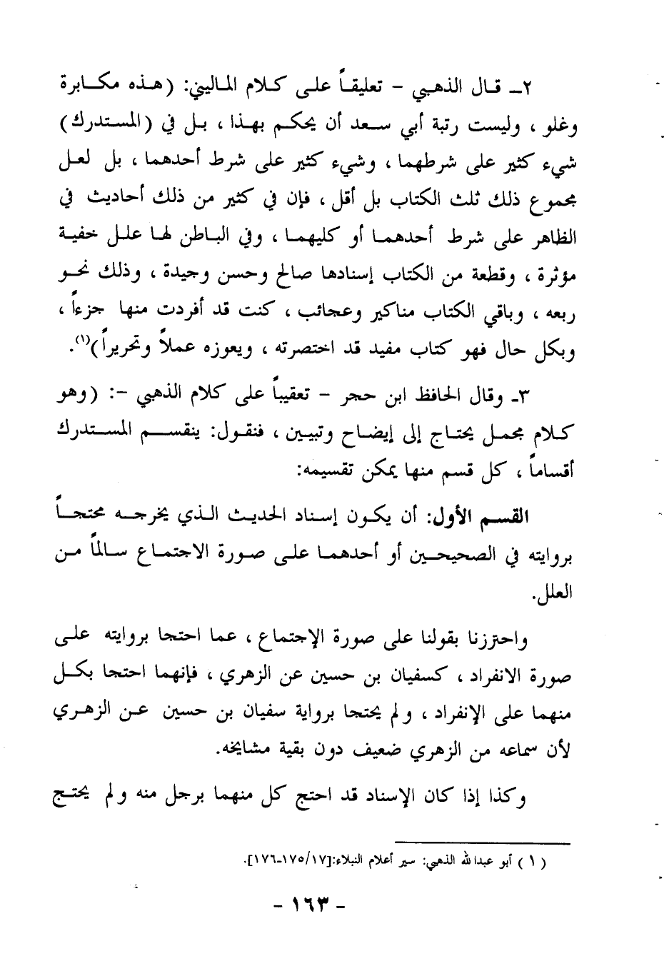 3- وقال الحافظ ابن حجر - تعقيباً على كلام الذهبي -: "وهو كلام مجمل يحتاج إلى إيضاح وتبيين، فنقول: ينقسم المستدرك أقساماً، كل قسم منها يمكن تقسيمه: