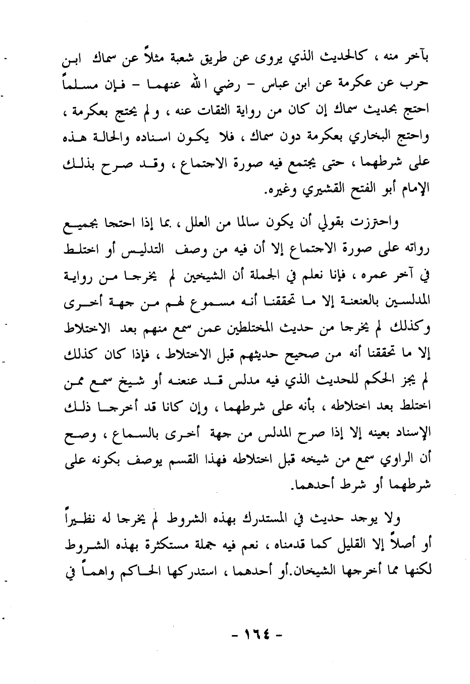 واحترزتُ بقولي: أن يكون سالما من العلل، بما إذا احتجا بجميع رواته على صورة الاجتماع إلا أن فيه من وُصِف بالتدليس أو اختلط في آخر عمره، فإنا نعلم في الجملة أن الشيخين لم يخرجا من رواية المدلسين بالعنعنة إلا ما تحققا أنه مسموع لهم من جهة أخرى، وكذلك لم يخرجا من حديث المختلطين عمن سمع منهم بعد الاختلاط إلا ما تحققا أنه من صحيح حديثهم قبل الاختلاط، فإذا كان كذلك لم يجز الحكم للحديث الذي فيه مدلس قد عنعنه، أو شيخ سمع ممن اختلط بعد اختلاطه بأنه على شرطهما وإن كانا قد أخرجا ذلك الإسناد بعينه، إلا إذا صرح المدلس من جهة أخرى بالسماع، وصح أن الراوي سمع من شيخه قبل اختلاطه، فهذا القسم يوصف بكونه على شرطهما أو شرط أحدهما.