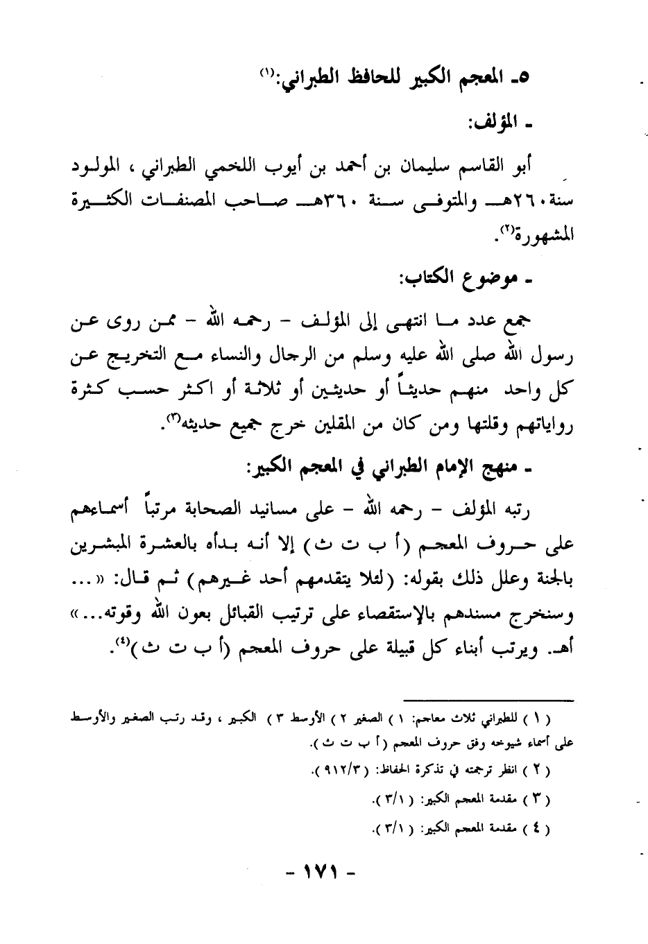 1 للطبراني ثلاثة معاجم: الصغير، والأوسط، الكبير، وقد رتَّب الصغير والأوسط على أسماء شيوخه وفق حروف المعجم أب ت ث.