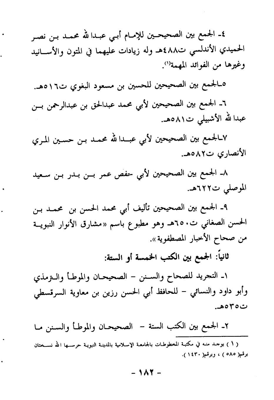 4- الجمع بين الصحيحين للإمام أبي عبد الله محمد بن نصر الحميدي الأندلسي (ت 488هـ) ، وله زيادات عليهما في المتون والأسانيد وغيرها من الفوائد المهمة. 1