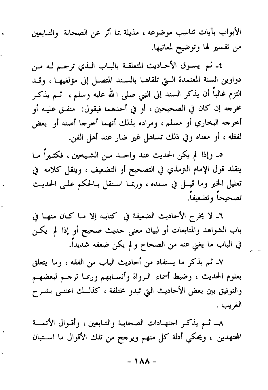 4- ثم يسوق الأحاديث المتعلقة بالباب الذي ترجم له من دواوين السُّنَّة المعتمدة التي تلقَّاها بالسند المتصل إلى مؤلفيها، وقد التزم غالباً أن يذكر السند إلى النبي صلى الله عليه وسلم، ثم يذكر مخرجه إن كان في الصحيحين، أو في أحدهما فيقول: "متفق عليه" أو "أخرجه البخارى - أو - مسلم"، ومراده بذلك أنهما أخرجا أصله أو بعض لفظه، أو معناه وفي ذلك تساهل غير ضارٍّ عند أهل الفن.