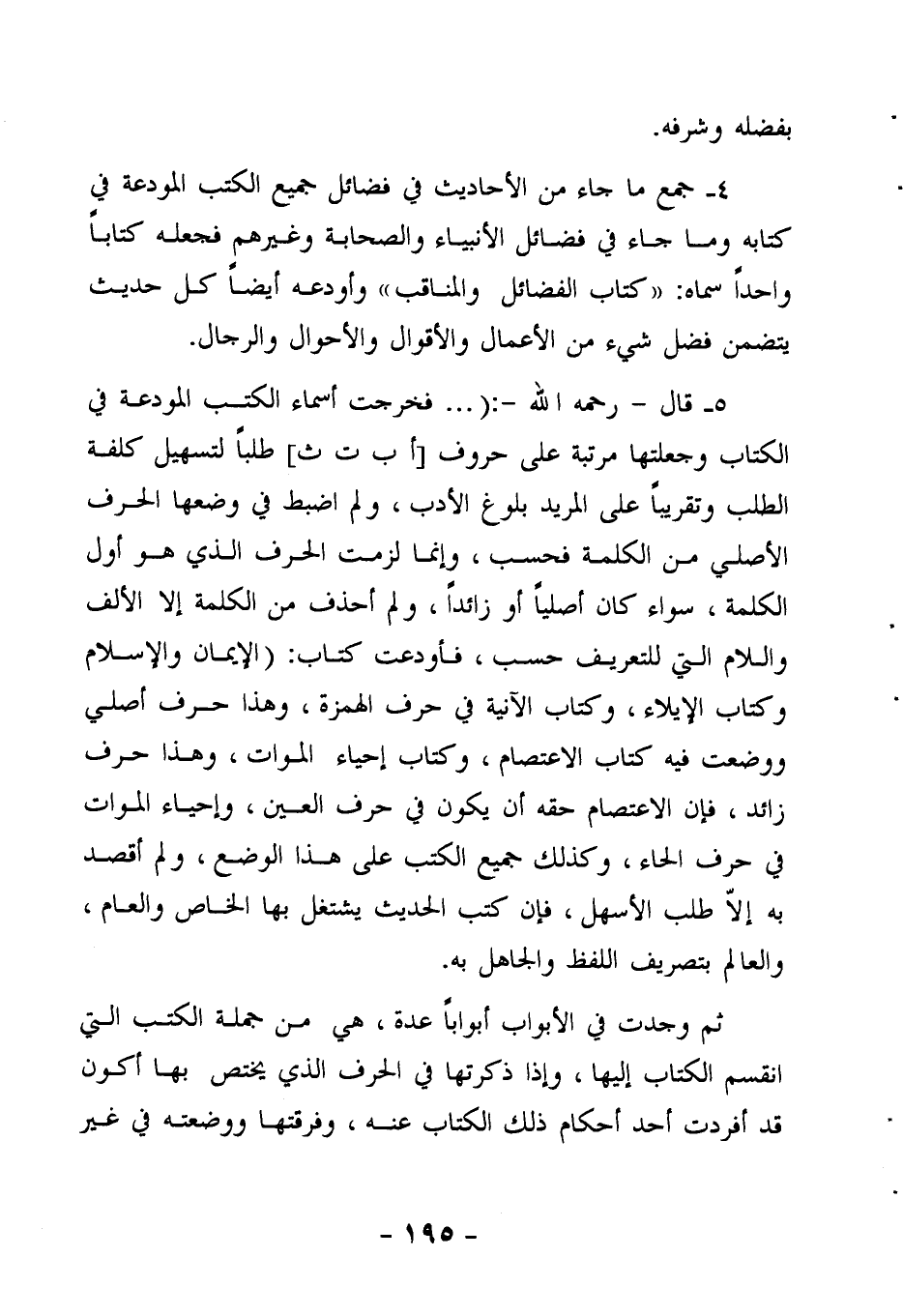 5- قال - رحمه الله -: " ... فخرجت أسماء الكتب المودعة في الكتاب وجعلتها مرتبة على حروف أب ت ث طلباً لتسهيل كلفة الطلب، وتقريباً على المريد بلوغ الأرب، ولم أضبط في وضعها الحرف الأصلي من الكلمة فحسب، وإنما لزمت الحرف الذي هو أول الكلمة، سواء كان أصلياً أو زائداً، ولم أحذف من الكلمة إلا الألف واللام التي للتعريف حسب، فأودعت كتاب: الإيمان، والإسلام، وكتاب الإيلاء، وكتاب الآنية في حرف الهمزة، وهذا حرف أصلي ووضعت فيه كتاب الإعتصام، وكتاب إحياء الموات، وهذا حرف زائد؛ فإن الإعتصام حقه أن يكون في حرف العين، وإحياء الموات في حرف الحاء، وكذلك جميع الكتب على هذا الوضع، ولم أقصد به إلا طلب الأسهل، فإن كتب الحديث يشتغل بها الخاص والعام، والعالم بتصريف اللفظ والجاهل به.