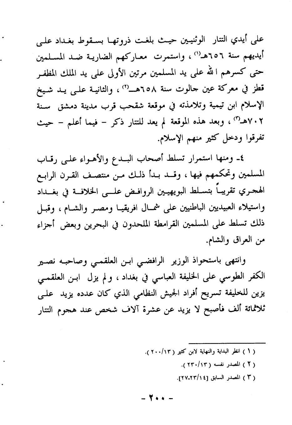 على أيدي التتار الوثنيين حيث بلغت ذروتها بسقوط بغداد على أيديهم سنة (656 هـ) 1، واستمرت معاركهم الضارية ضد المسلمين حتى كسرهم الله على يد المسلمين مرتين: الأولى على يد الملك المظفر قطز في معركة عين جالوت سنة (658 هـ) 2، والثانية على يد شيخ الإسلام ابن تيمية وتلامذته في موقعة شقحب قرب مدينة دمشق سنة (702هـ) 3، وبعد هذه الموقعة لم يعد للتتار ذكر - فيما أعلم - حيث تفرقوا ودخل كثير منهم الإسلام.