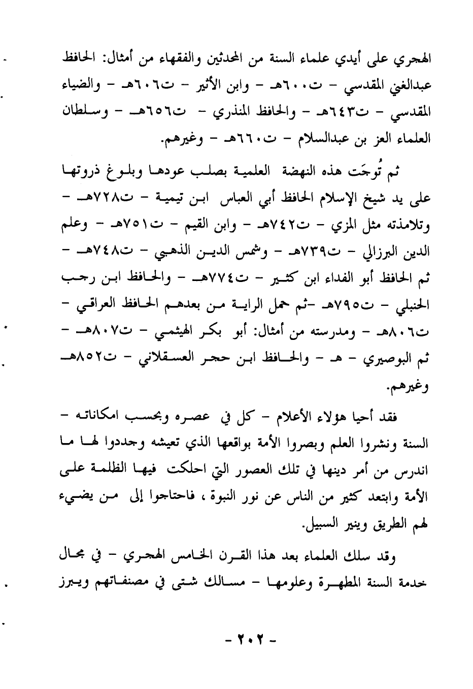 ثم تُوجَت هذه النهضة العلمية بصلب عودها وبلوغ ذروتها على يد شيخ الإسلام الحافظ أبي العباس ابن تيمية (ت 728هـ) وتلامذته مثل: المزي (ت 742 هـ) ، وابن القيم (ت 751 هـ) ، وعلم الدين البرزالي (ت 739 هـ) ، وشمس الدين الذهبي (ت 748 هـ) ، ثم الحافظ أبو الفداء ابن كثير (ت 774 هـ) ، والحافظ ابن رجب الحنبلي (ت هـ79 هـ) ، ثم حمل الراية من بعدهم الحافظ العراقي (ت 806 هـ) ومدرسته من أمثال: أبو بكر الهيثمي (ت 807 هـ) ، ثم البوصيري (ت 840 هـ) ، والحافظ ابن حجر العسقلاني (ت 852 هـ) وغيرهم.