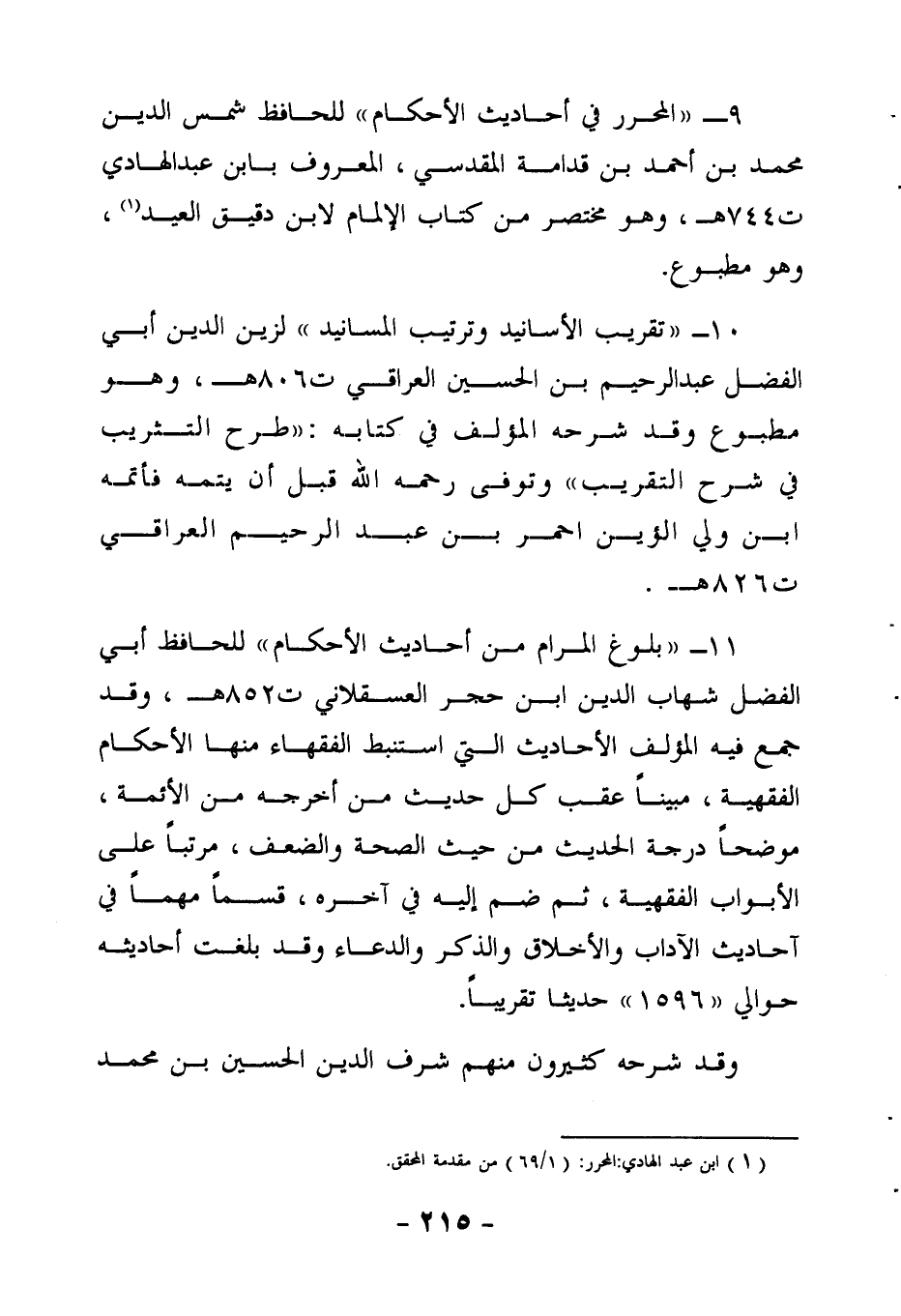 9- المحرر في أحاديث الأحكام للحافظ شمس الدين محمد بن أحمد بن قدامة المقدسي المعروف بابن عبد الهادي (ت 744 هـ) ، وهو مختصر من كتاب "الإلمام" لابن دقيق العيد 1 وهو مطبوع.