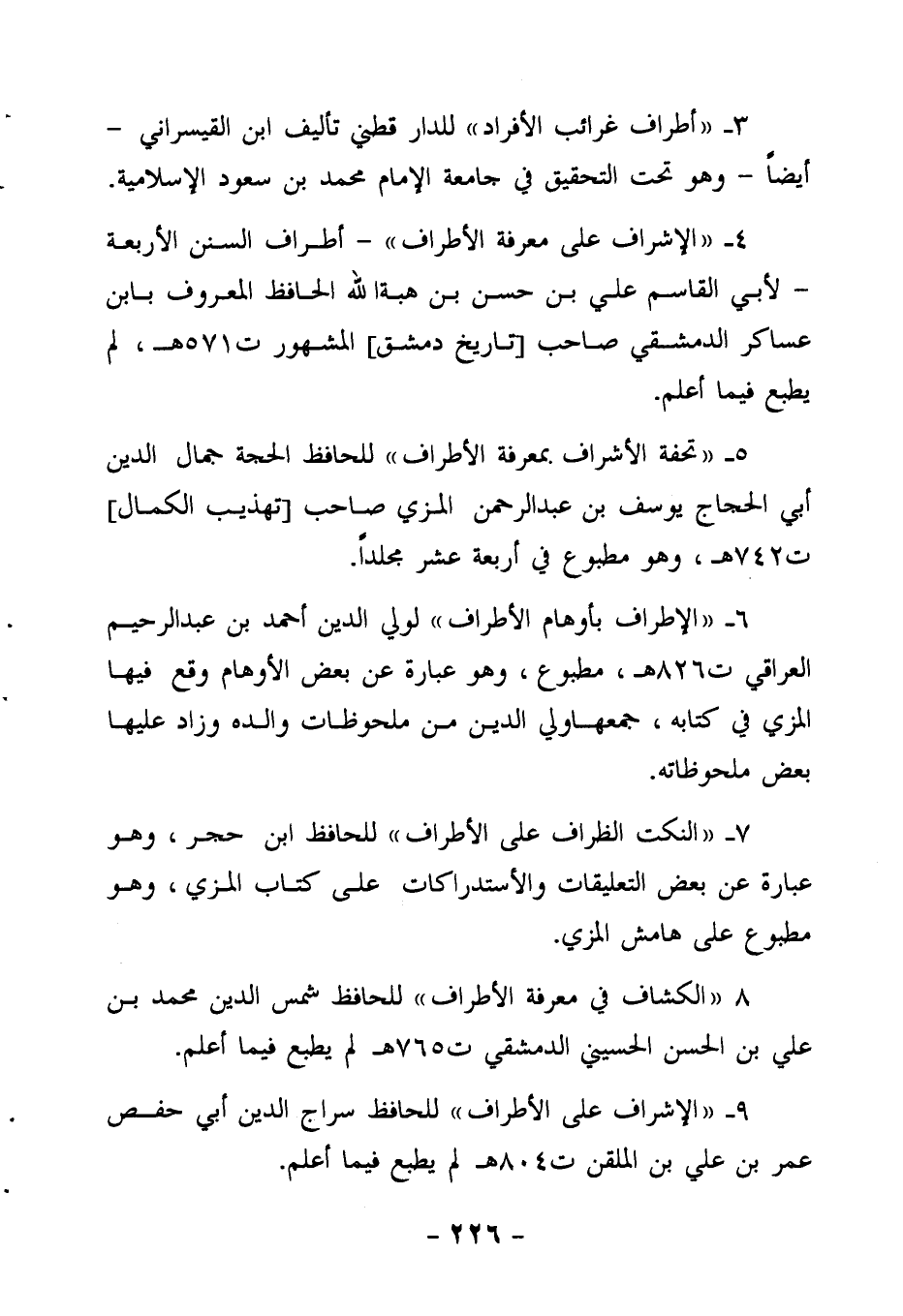 7- النكت الظراف على الأطراف للحافظ ابن حجر، وهو عبارة عن بعض التعليقات والاستدراكات على كتاب المزي، وهو مطبوع على هامش المزي.