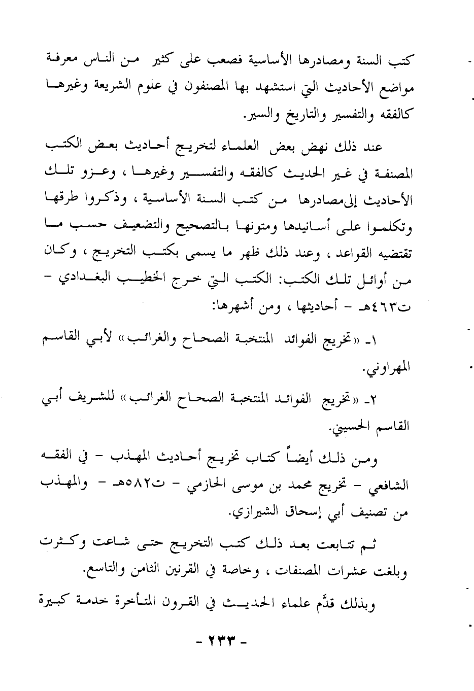 ومن ذلك أيضاً كتاب تخريج أحاديث المهذَّب - في الفقه الشافعي - تخريج محمد بن موسى الحازمي (ت 582 هـ) والمهذَّب من تصنيف أبي إسحاق الشيرازي.