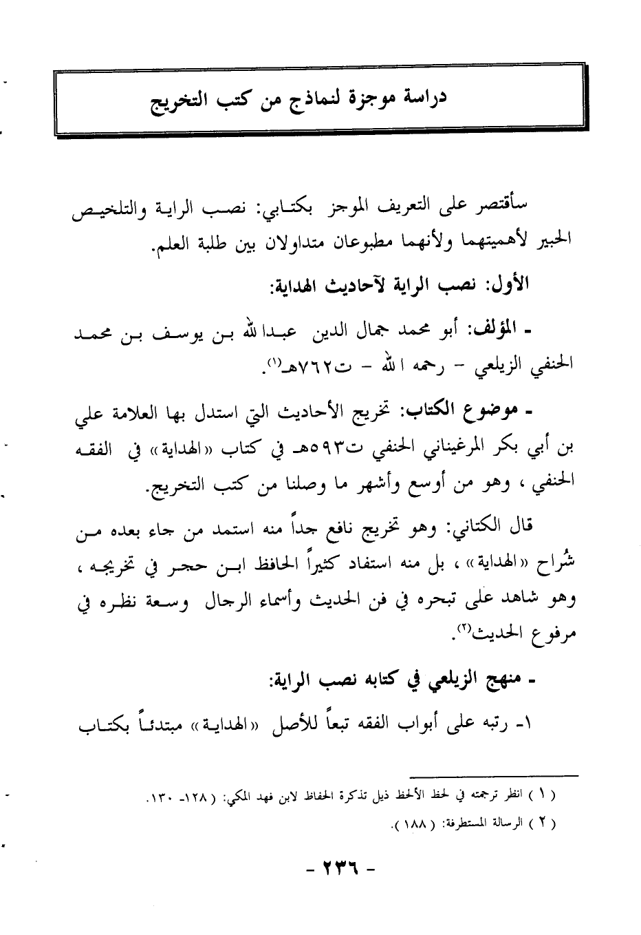 سأقتصر على التعريف الموجز بكتابى: "نصب الراية" و "التلخيص الحبير" لأهميتهما، ولأنهما مطبوعان متداولان بين طلبة العلم.
