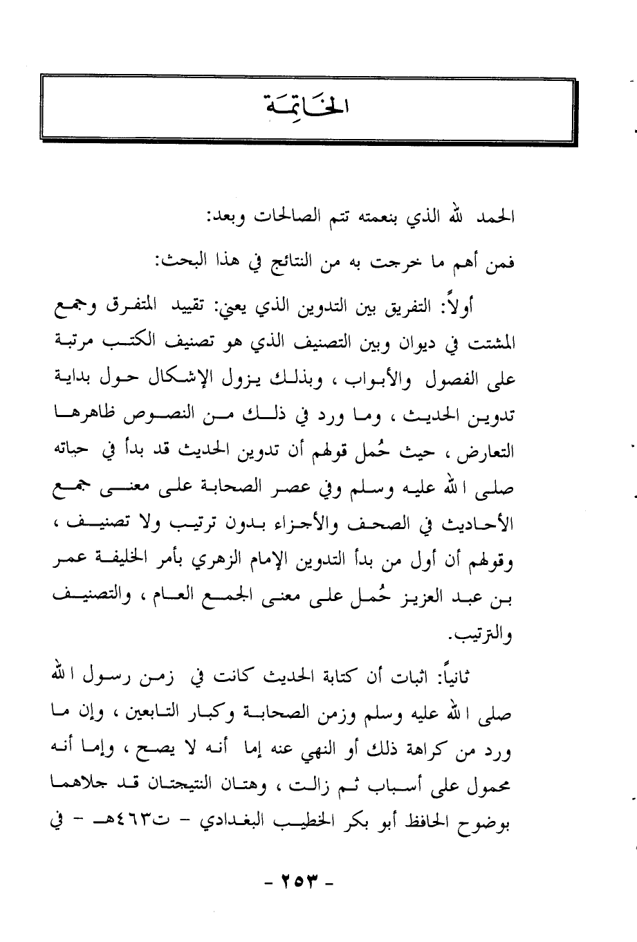ثانياً: إثبات أن كتابة الحديث كانت في زمن رسول الله صلى الله عليه وسلم وزمن الصحابة وكبار التابعين، وإن ما ورد من كراهة ذلك أو النهي عنه إما أنه لا يصح، وإما أنه محمول على أسباب ثم زالت، وهاتان النتيجتان قد جلاَّهما بوضوح الحافظ أبو بكر الخطيب البغدادي (ت 463 هـ) في