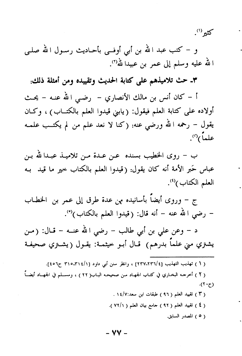 ب- روى الخطيب بسنده عن عدة من تلاميذ عبد الله بن عباس حَبر الأمَّة أنه كان يقول: "قيدوا العلم بالكتاب، خير ما قُيِّد به العلم الكتاب". 4