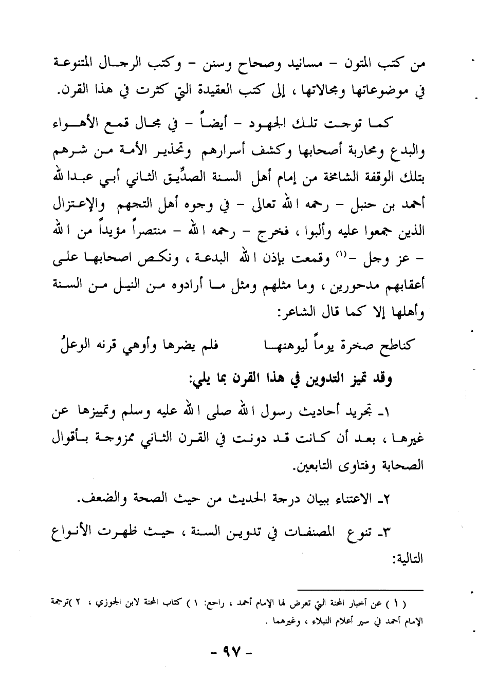كما تُوِّجت تلك الجهود أيضاً في مجال قمع الأهواء والبدع ومحاربة أصحابها وكشف أسرارهم وتحذير الأمَّة من شرِّهم بتلك الوقفة الشامخة من إمام أهل السُّنَّة الصدِّيق الثاني أبي عبد الله أحمد ابن حنبل - رحمه الله تعالى - في وجوه أهل التجهم والاعتزال الذين جمعوا عليه وألبوا، فخرج - رحمه الله - منتصراً مؤيَّداً من الله - عز وجل 1 - وقمعت بإذن الله البدعة، ونكص أصحابها على أعقابهم مدحورين، وما مثلهم ومثل ما أرادوه من النيل من السُّنَّة وأهلها إلا كما قال الشاعر: