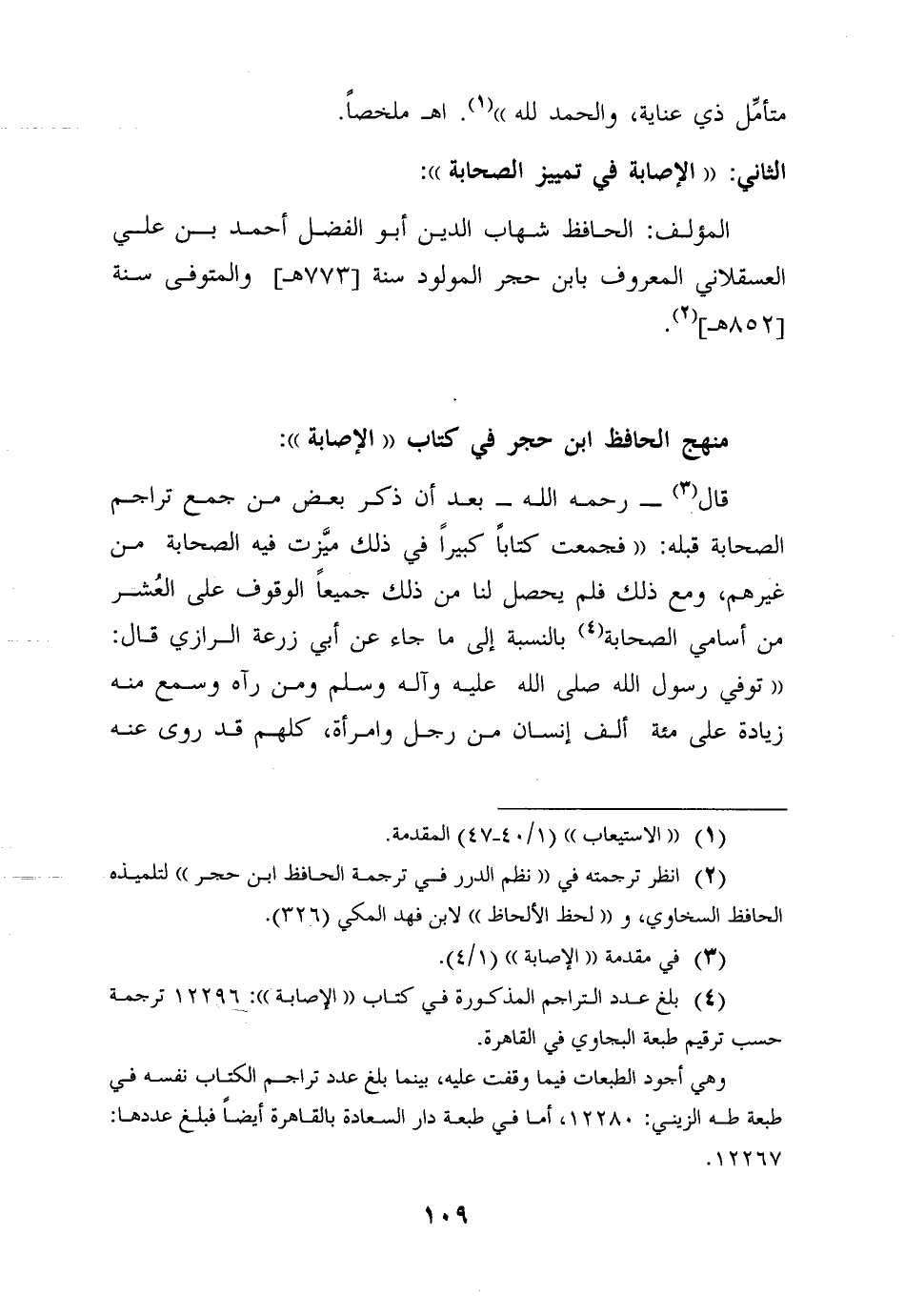 4بلغ عدد التراجم المذكورة في كتاب الإصابة (12296 ترجمة) حسب ترقيم طبعة البجاوي في القاهرة. وهي أجود الطبعات فيما وقفت عليه، بينما بلغ عدد تراجم الكتاب نفسه في طبعة طه الزيني (12280) ، أما في طبعة دار السعادة بالقاهرة أيضاً فبلغ عددها: (12267) .