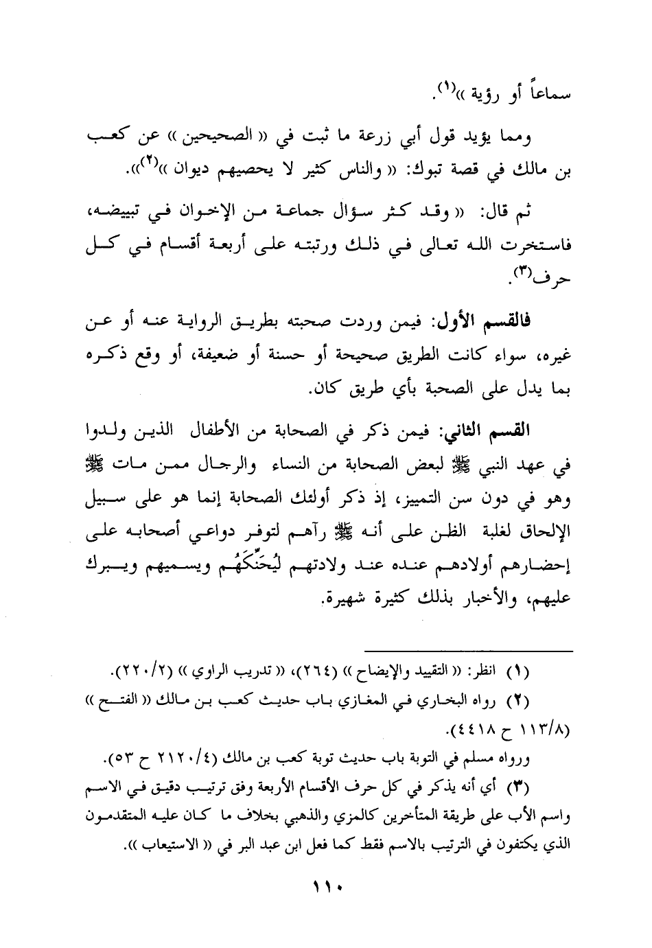 3أي أنه يذكر في كل حرف الأقسام الأربعة وفق ترتيب دقيق في الاسم واسم الأب على طريقة المتأخرين كالمزي والذهبي بخلاف ما كان عليه المتقدمون الذي يكتفون في الترتيب بالاسم فقط كما فعل ابن عبد البر في الاستيعاب.
