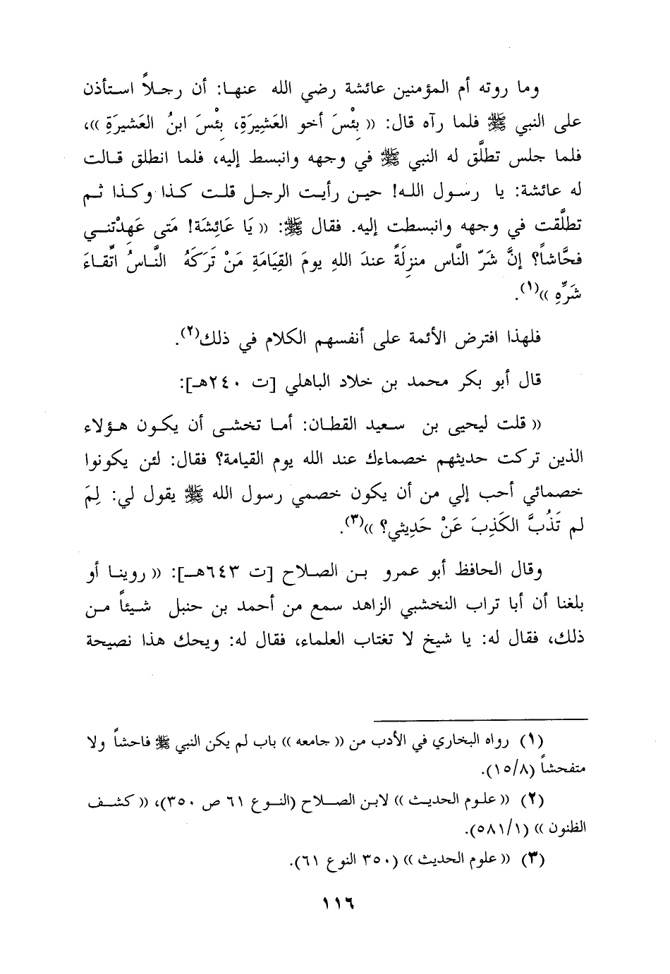 وما روته أم المؤمنين عائشة رضي الله عنها: أن رجلاً استأذن على النبي صلى الله عليه وسلم فلما رآه قال: "بِئْسَ أخو العَشِيرةِ، بِئْسَ ابن العَشِيرةِ"، فلما جلس تطلَّق له النَّبي صلى الله عليه وسلم في وجهه وانبسط إليه، فلما انطلق قالت له عائشة: يا رسول الله! حين رأيت الرجل قلت كذا وكذا، ثم تطلَّقت في وجهه وانبسطت إليه. فقال صلى الله عليه وسلم: "يا عَائِشَة! مَتَى عَهِدْتني فَحَّاشاً؟ إِنَّ شَرَّ النَّاسِ منزلةً عندَ اللهِ يوم القيامة مَن تَرَكَهُ النَّاسُ اتِّقاءَ شَرِّه" 1.