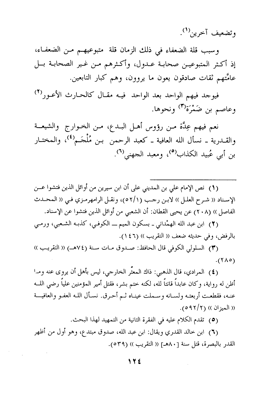 وسبب قلة الضعفاء في ذلك الزمان قلة متبوعيهم من الضعفاء، إذ أكثر المتبوعين صحابة عدول، وأكثرهم من غير الصحابة بل عامَّتهم ثقات صادقون يَعُون ما يروون، وهم كبار التابعين.