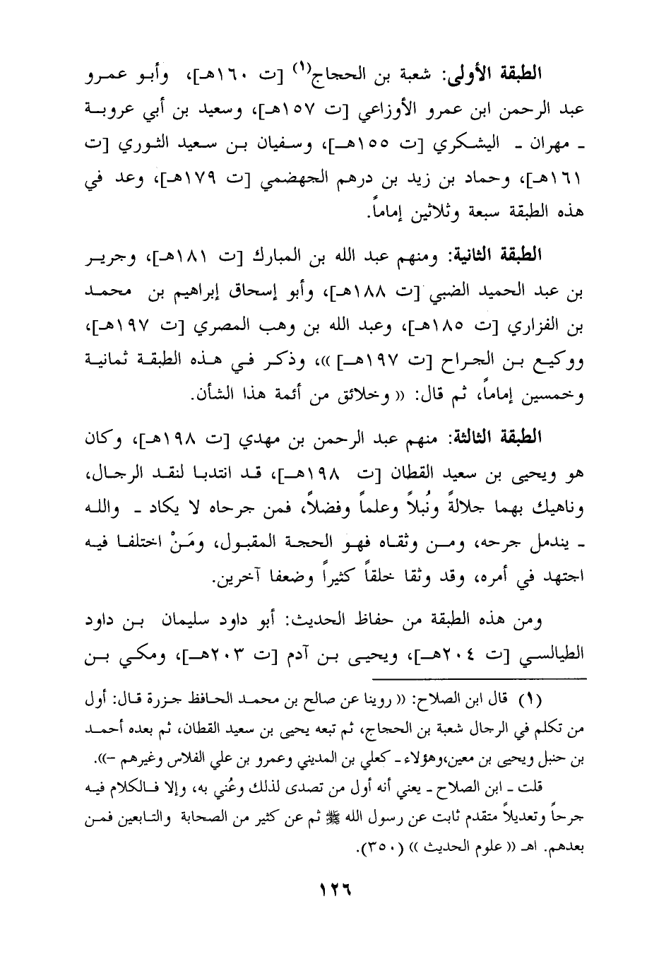 1قال ابن الصلاح: "روينا عن صالح بن محمد جزرة قال: أول من تكلم في الرجال شعبة بن الحجاج، ثم تبعه يحي بن سعيد القطان، ثم بعده أحمد بن حنبل ويحي بن معين، وهؤلاء - كعلي بن المديني وعمرو بن علي الفلاس وغيرهم -.