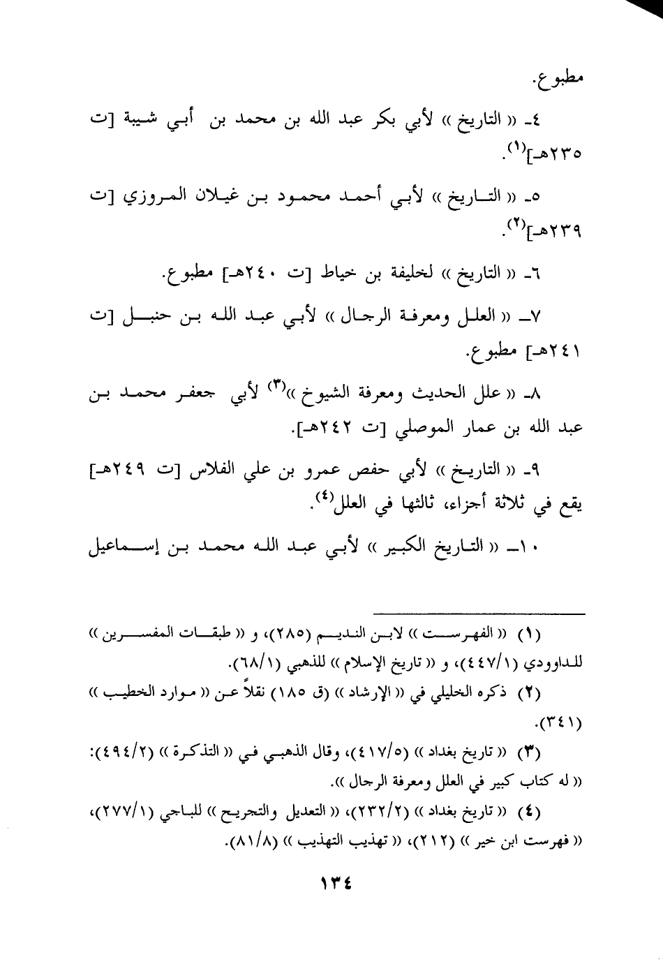 9- التاريخ لأبي حفص عمرو بن علي الفلاس (ت 249 هـ) يقع في ثلاثة أجزاء، ثالثها في العلل 4.