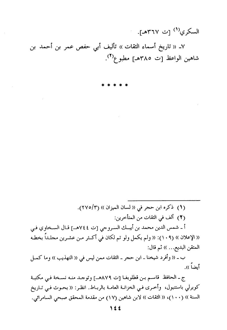 7- تاريخ أسماء الثقات تأليف أبي حفص عمر بن أحمد بن شاهين الواعظ (ت 385 هـ) ، مطبوع. 2