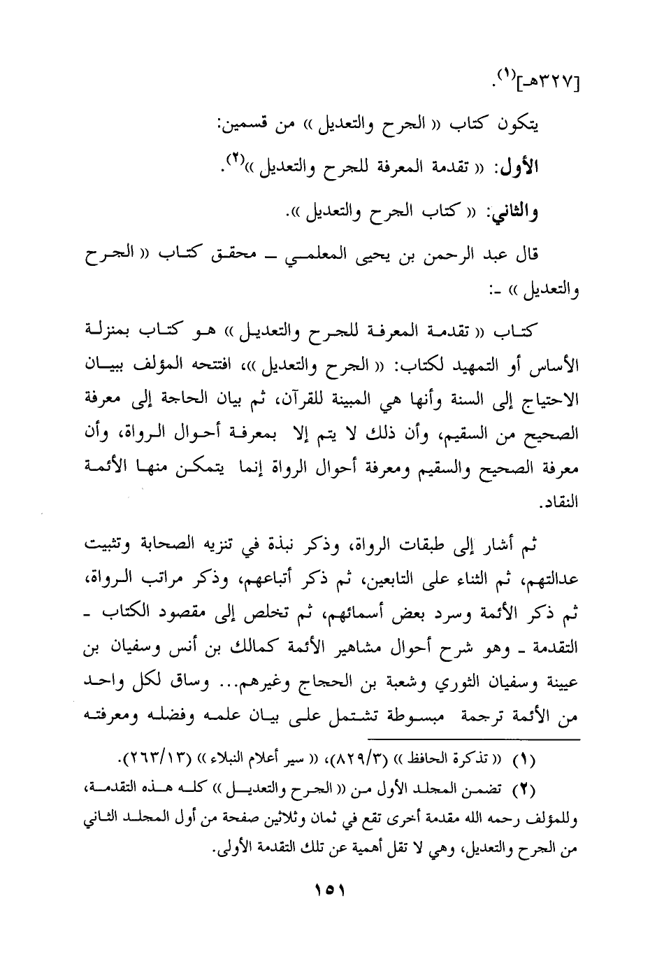 2تضمن المجلد الأول من الجرح والتعديل كله هذه التقدمة، وللمؤلف رحمه الله مقدمة أخرى تقع في ثمانٍ وثلاثين صفحة من أول المجلد الثاني من الجرح والتعديل، وهي لا تقل أهمية عن تلك التقدمة الأولى.
