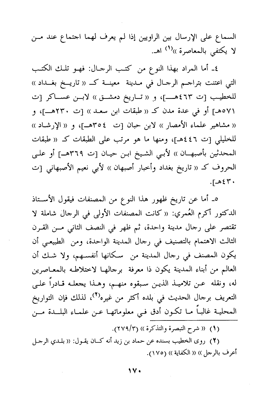 5- أما عن تاريخ ظهور هذا النوع من المصنفات فيقول الأستاذ الدكتور أكرم العُمري: "كانت المصنفات الأولى في الرجال شاملة لا تقتصر على رجال مدينة واحدة، ثم ظهر في النصف الثاني من القرن الثالث الاهتمام بالتصنيف في رجال المدينة الواحدة، ومن الطبيعي أن يكون المصنِّف في رجال المدينة من سكانها أنفسهم، ولا شك أن العالم من أبناء المدينة يكون ذا معرفة برجالها لاختلاطه بالمعاصرين له، ونقله عن تلاميذ الذين سبقوه منهم، وهذا يجعله قادراً على التعريف برجال الحديث في بلده أكثر من غيره 2، لذلك فإن التواريخ المحلية غالباً ما تكون أدق في معلوماتها عن علماء البلدة من