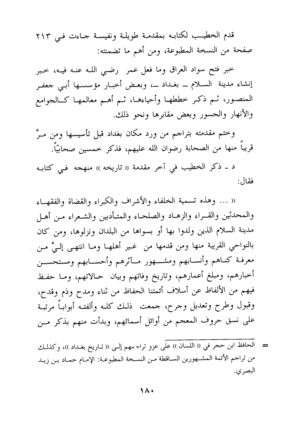 " ... وهذه تسمية الخلفاء والأشراف والكبراء والقضاة والفقهاء والمحدِّثين والقرَّاء والزهَّاد والصلحاء والمتأدِّبين والشعراء من أهل مدينة السلام الذين ولدوا بها أو بسواها من البلدان ونزلوها، ومن كان بالنواحي القريبة منها، ومن قدمها من غير أهلها وما انتهى إليَّ من معرفة كناهم وأنسابهم ومشهور مآثرهم وأحسابهم، ومستحسن أخبارهم، ومبلغ أعمارهم، وتاريخ وفاتهم وبيان حالاتهم، وما حفظ فيهم من الألفاظ عن أسلاف أئمتنا الحفاظ من ثناء ومدح، وذمٍّ وقدح، وقبول وطرح، وتعديل وجرح، جمعت ذلك كله وألَّفته أبواباً مرتبة على نسق حروف المعجم من أوائل أسمائهم، وبدأت منهم بذكر من