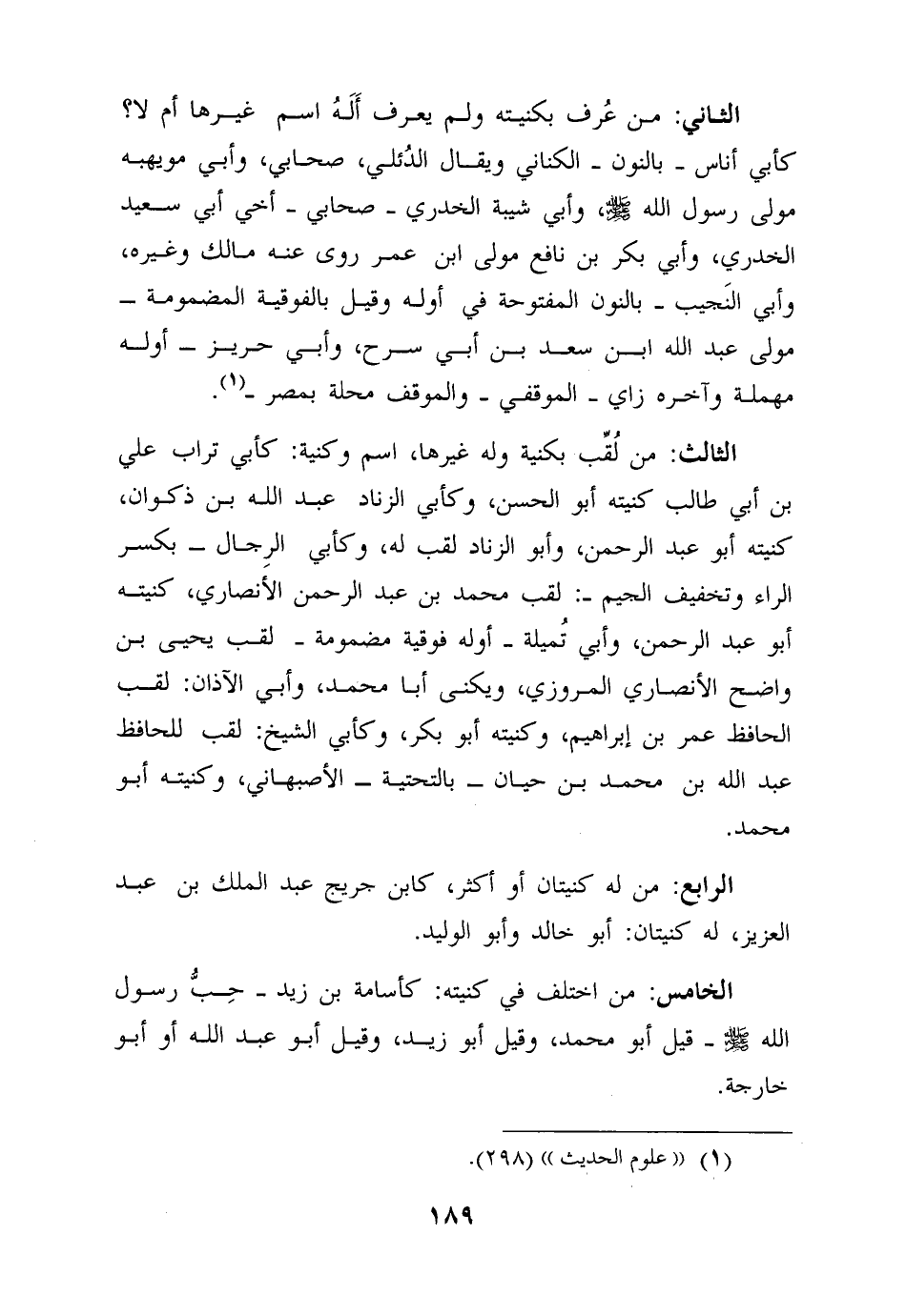 الثالث: من لُقِّب بكنية وله غيرها، اسم وكنية: كأبي تراب علي ابن أبي طالب، كنيته أبو الحسن، وكأبي الزناد عبد الله بن ذكوان، كنيته أبو عبد الرحمن، وأبو الزناد لقب له، وكأبي الرِجال - بكسر الراء وتخفيف الجيم -: لقب محمد بن عبد الرحمن الأنصاري، كنيته أبو عبد الرحس، وأبي تُميلة - أوله فوقية مضمومة - لقب يحيى بن واضح الأنصاري المروزي، ويكنى أبا محمد، وأبي الآذان: لقب الحافظ عمر بن إبراهيم، وكنيته أبو بكر، وكأبي الشيخ: لقب للحافظ عبد الله بن محمد بن حيان - بالتحتية - الأصبهاني، وكنيته أبو محمد.