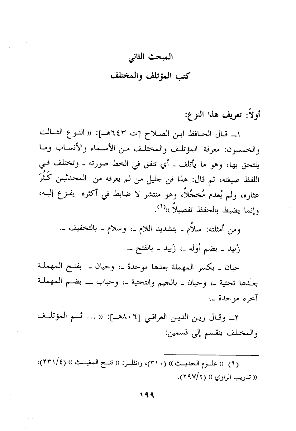 1- قال الحافظ ابن الصلاح (ت 643 هـ) : "النوع الثالث والخمسون: معرفة المؤتلف والمختلف من الأسماء والأنساب وما يلتحق بها، وهو ما يأتلف - أي تتفق في الخط صورته - وتختلف في اللفظ صيغته، ثم قال: هذا فن جليل من لم يعرفه من المحدثين كَثُرَ عثاره، ولم يُعدم مُخجِّلاً، وهو منتشر لا ضابط في أكثره يفزع إليه، وإنما يضبط بالحفظ تفصيلاً". 1