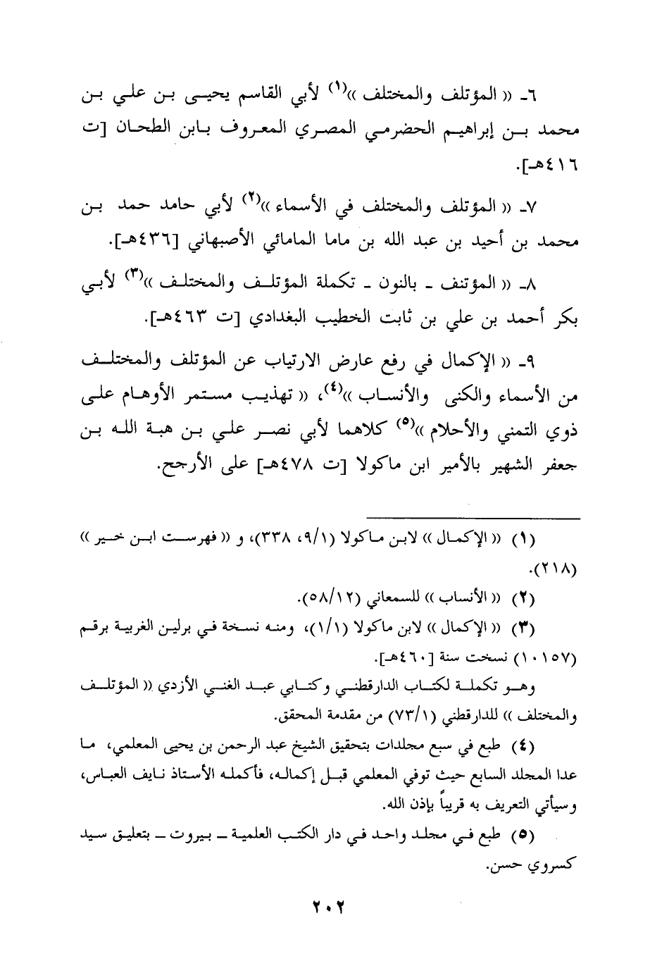 9- الإكمال في رفع عارض الارتياب عن المؤتلف والمختلف من الأسماء والكنى والأنساب 4، وتهذيب مستمر الأوهام على ذوي التمني والأحلام 5 كلاهما لأبي نصر علي بن هبة الله بن جعفر الشهير بالأمير ابن ماكولا (ت 478 هـ) على الأرجح