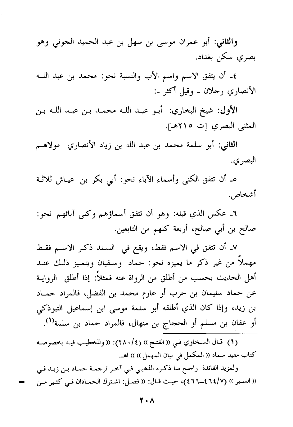 4- أن يتفق الاسم واسم الأب والنسبة نحو: محمد بن عبد الله الأنصاري رجلان - وقيل أكثر -: