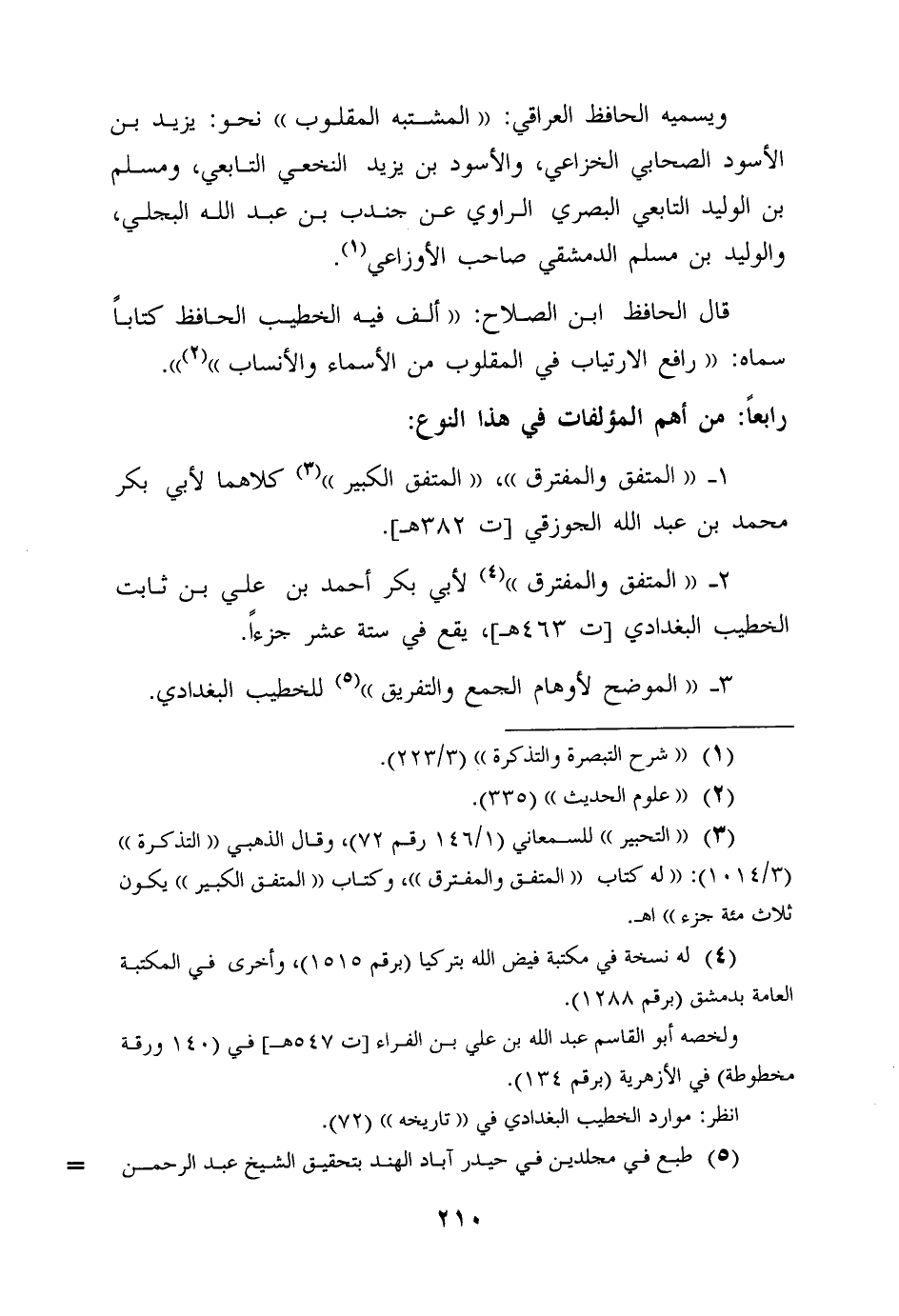 2- المتفق والمفترق 4 لأبي بكر أحمد بن علي بن ثابت الخطيب البغدادي (ت 463 هـ) ، يقع في ستة عشر جزءاً.