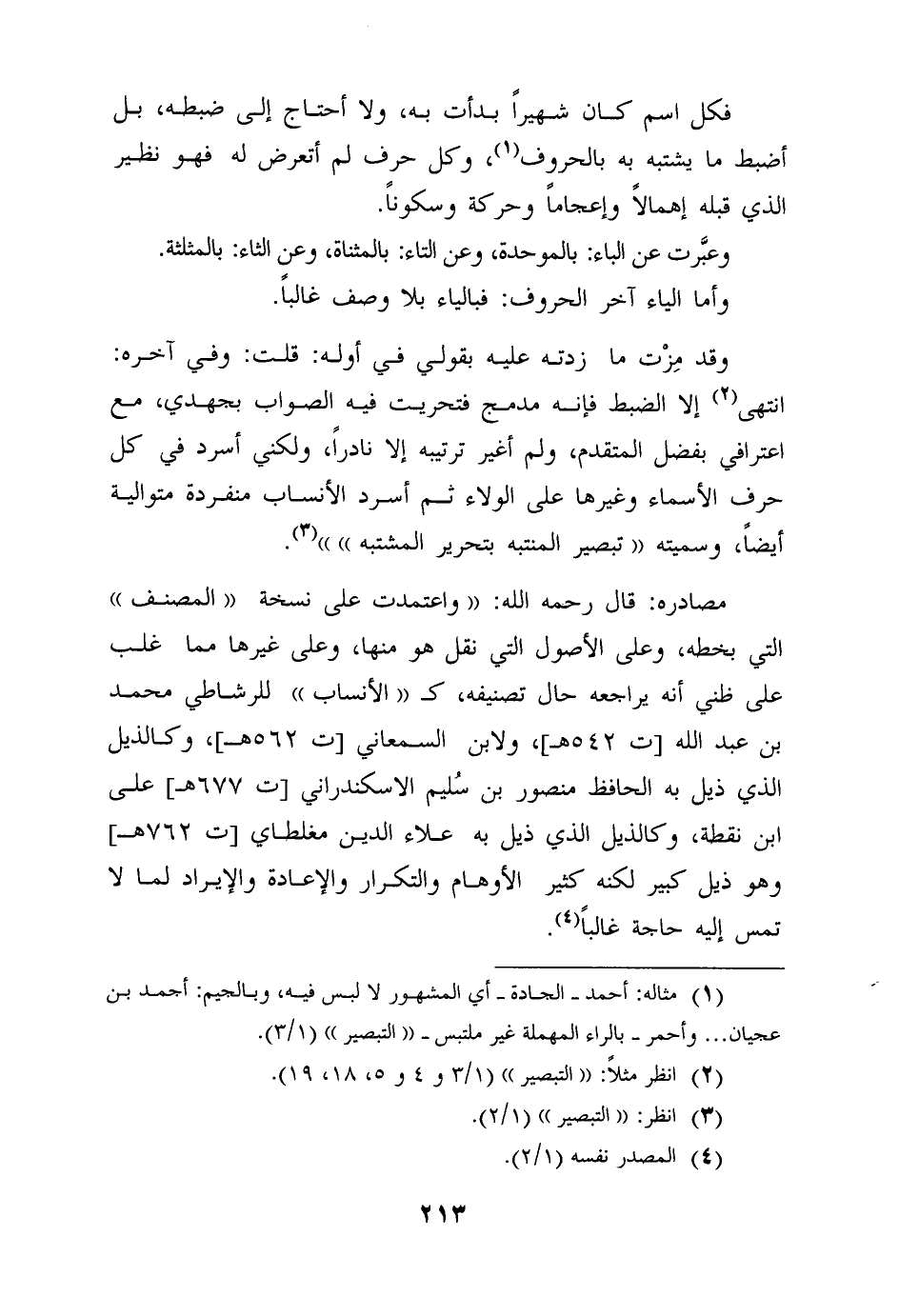قال رحمه الله: "واعتمدت على نسخة "المصنف" التي بخطه، وعلى الأصول التي نقل هو منها، وعلى غيرها مما غلب على ظني أنه يراجعه حال تصنيفه، كـ "الأنساب" للرشاطي محمد بن عبد الله (ت 542 هـ) ، ولابن السمعاني (ت 562 هـ) ، وكالذيل الذي ذيل به الحافظ منصور بن سُليم الاسكندراني (ت 677 هـ) على ابن نقطة، وكالذيل الذي ذيل به علاء الدين مغلطاي (ت 762 هـ) وهو ذيل كبير لكنه كثير الأوهام والتكرار والإعادة والإيراد لما لا تمس إليه حاجة غالباً". 4