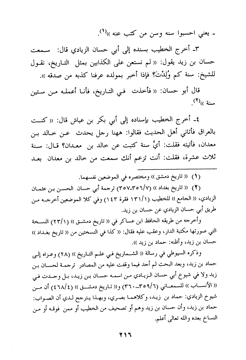 وذكره السيوطي في رسالة الشماريخ في علم التاريخ (ص: 28) وعزاه إلى حماد بن زيد، وبعد البحث لم أجد فيما وقفت عليه من المصادر ترجمة لحسان ابن زيد ولا في شيوخ أبي حسان الزيادي من اسمه حسان بن زيد، بل وجدت في الأنساب للسمعاني (6 / 359 - 360) ، وتاريخ دمشق (4 / 468) أن من شيوخ الزيادي: حماد بن زيد، وكلاهما بصري، وبهذا يترجح لدي أن الصواب: حماد بن زيد وأن حسان بن زيد وهم أو تصحيف من الخطيب أو ممن فوقه أو من النساخ بعده والله تعالى.