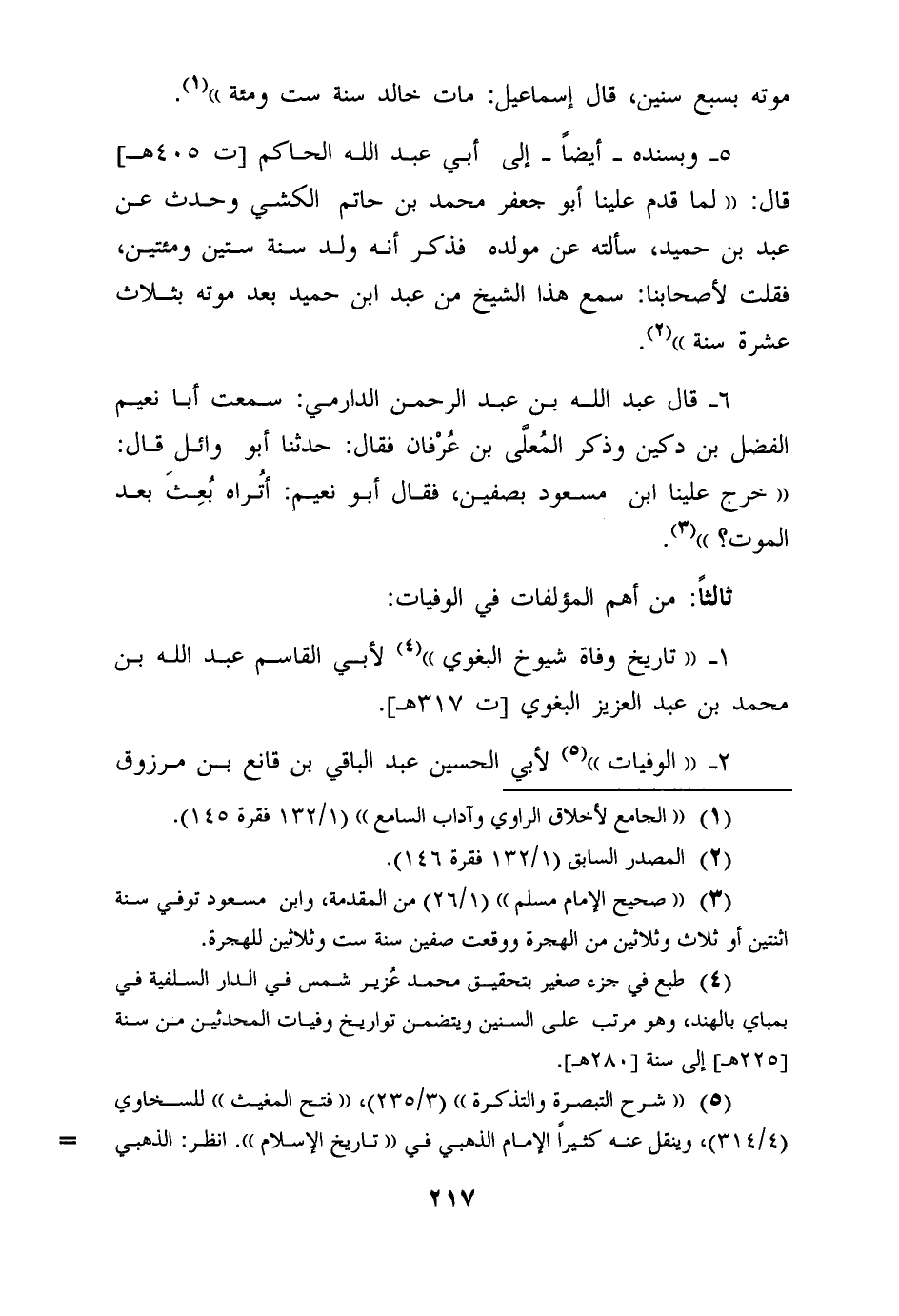 1- تاريخ وفاة شيوخ البغوي 4 لأبي القاسم عبد الله بن محمد بن عبد العزيز البغوي (ت 317 هـ) .2- الوفيات 5 لأبي الحسين عبد الباقي بن قانع بن مرزوق