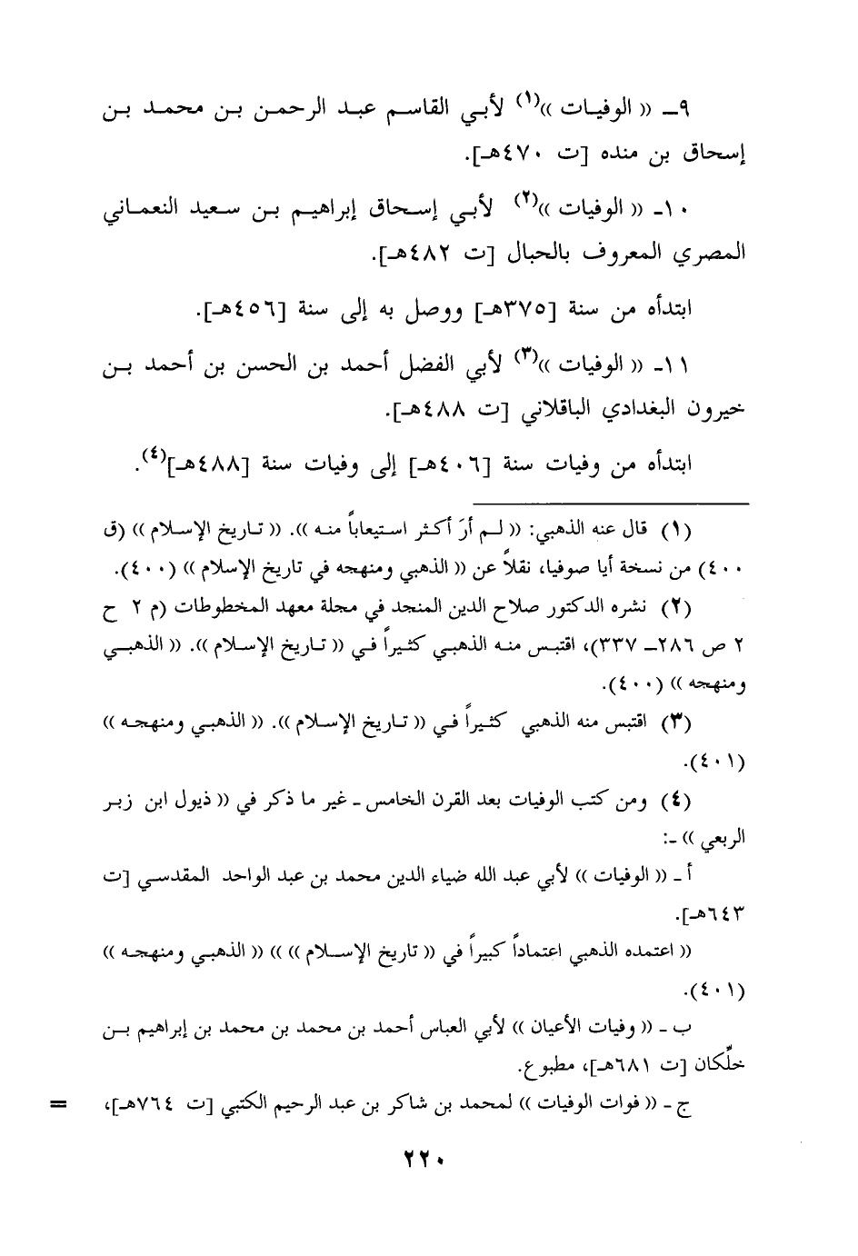 9- الوفيات 1 لأبي القاسم عبد الرحمن بن محمد بن إسحاق بن منده (ت 470 هـ) .