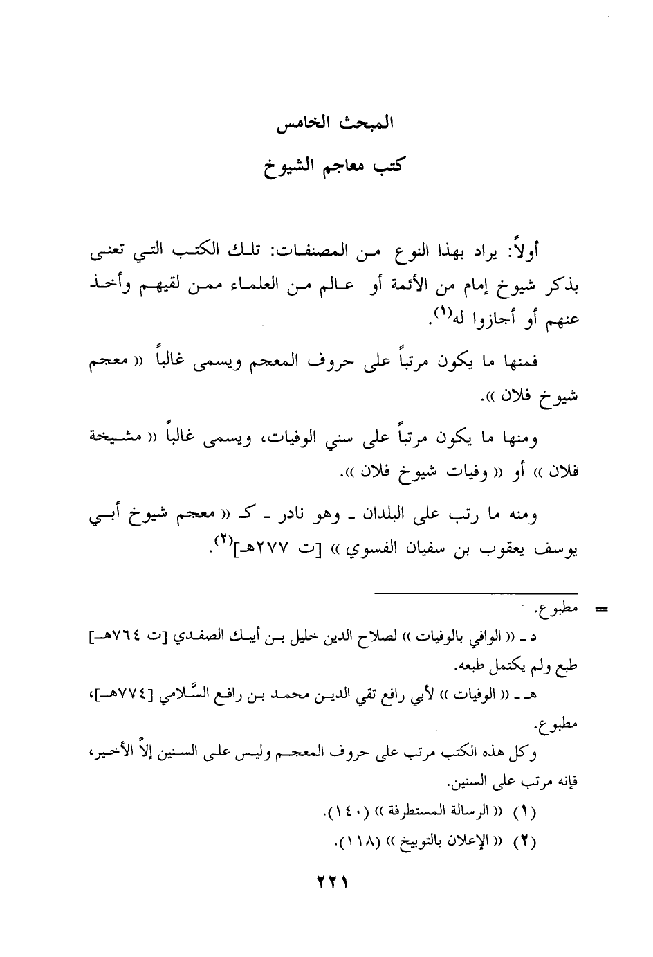 هي تلك الكتب التي تعنى بذكر شيوخ إمام من الأئمة أو عالم من العلماء ممن لقيهم وأخذ عنهم أو أجازوا له. 1