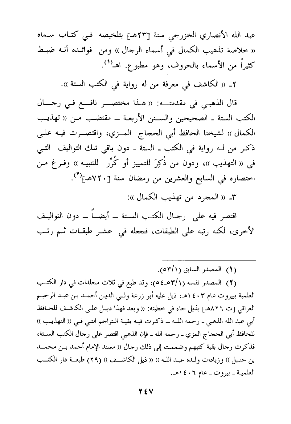 "خلاصة تذهيب تهذيب الكمال في أسماء الرجال" ومن فوائده أنه ضبط كثيراً من الأسماء بالحروف، وهو مطبوع. 1