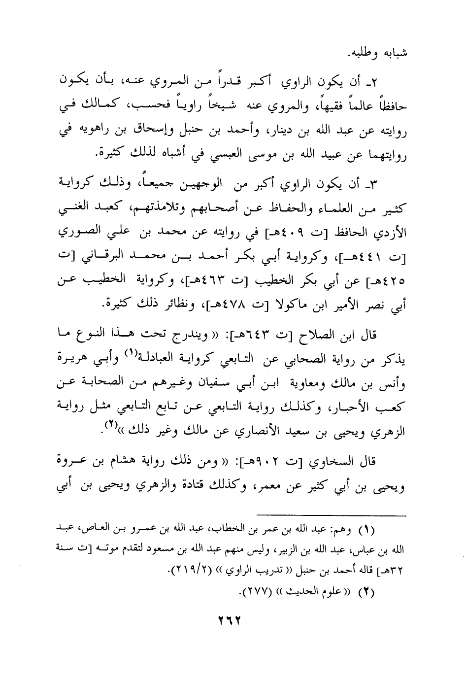 2- أن يكون الراوي أكبر قدراً من المروي عنه، بأن يكون حافظاً عالماً فقيهاً، والمروي عنه شيخاً راوياً فحسب، كمالك في روايته عن عبد الله بن دينار، وأحمد بن حنبل وإسحاق بن راهويه في روايتهما عن عبيد الله بن موسى العبسي في أشباه لذلك كثيرة.