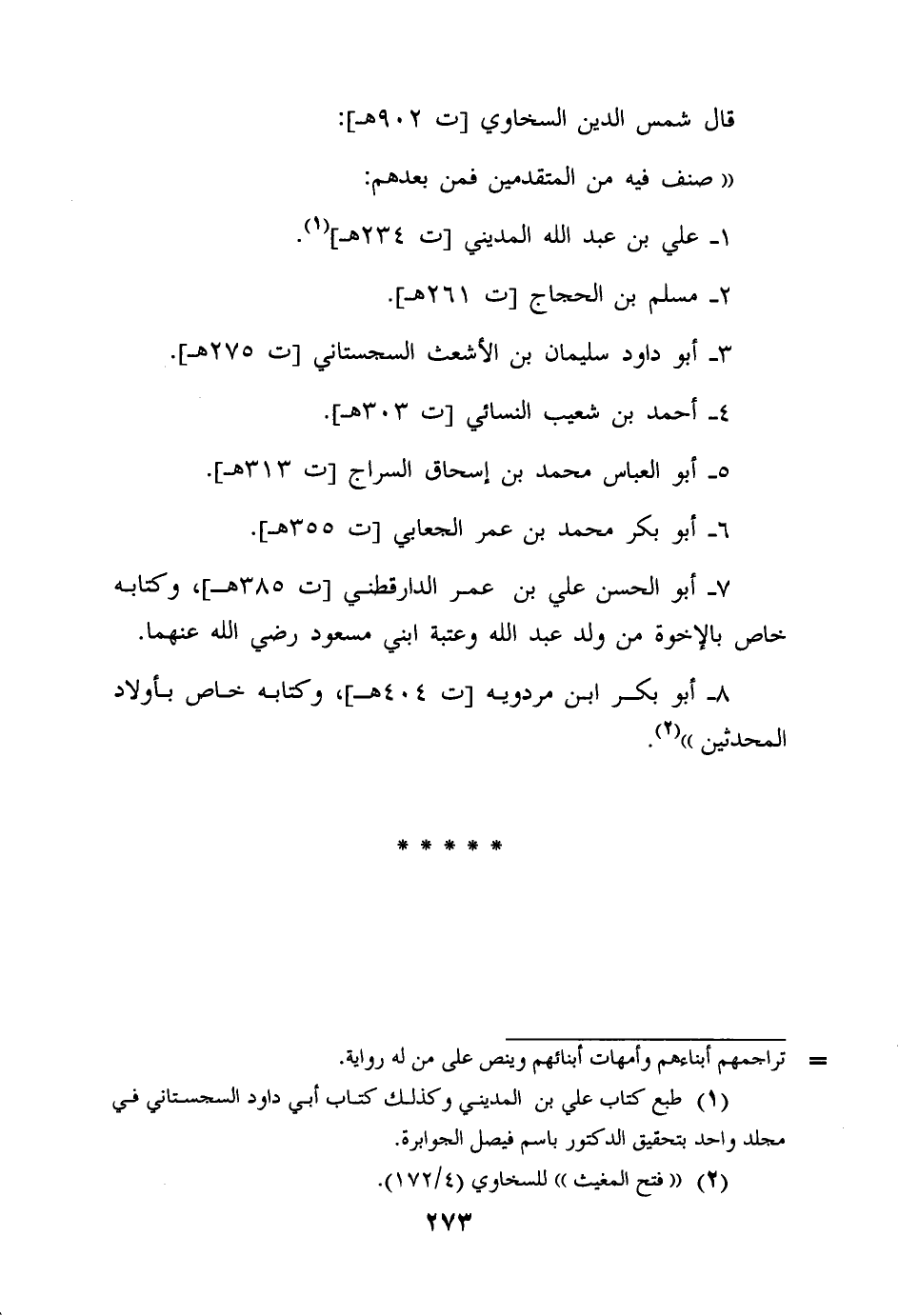 1طبع كتاب علي بن المديني وكذلك كتاب أبي داود السجستاني في مجلد واحد بتحقيق الدكتور باسم فيصل الجوابرة.